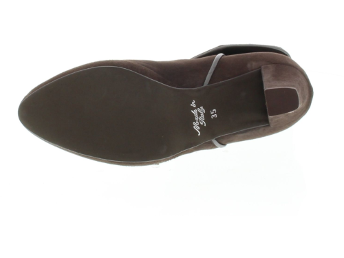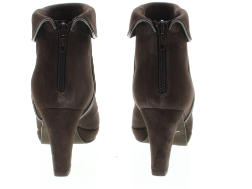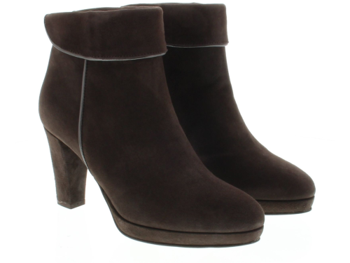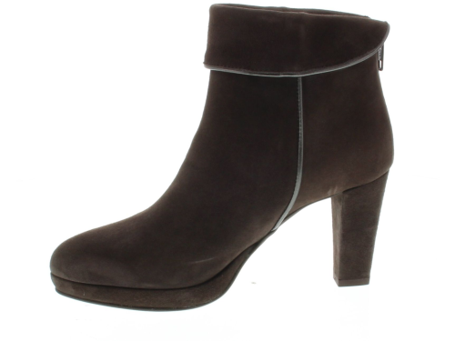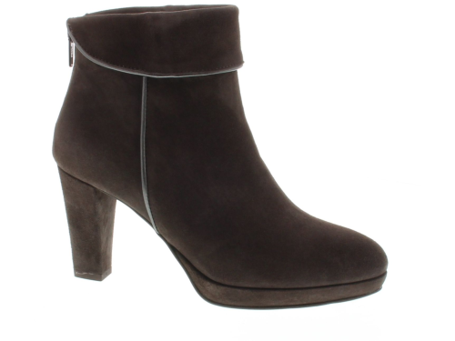 Kort laarsje met rits op de hiel en omslagje van Lilian. Uitgevoerd in bruin suede met metallic bies. Het omslagje kan ook omhoog gedragen worden. Dit model is zeer goed te combineren met rokje of jurkje. De hak is 7 cm hoog, maar voelt lager door het plateau.