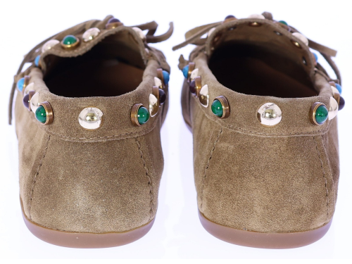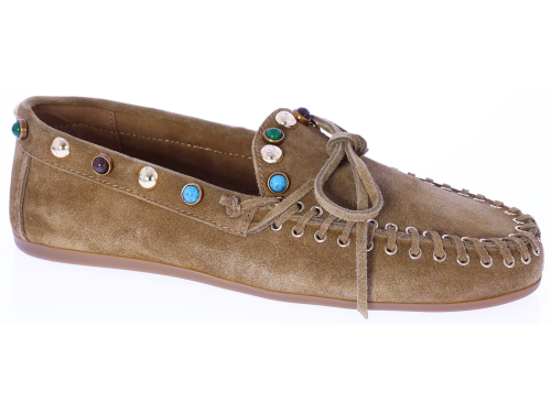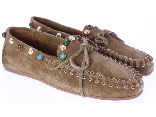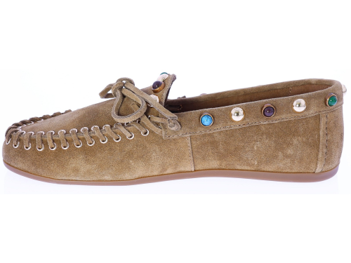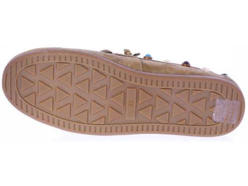 Bruin suède dames instappers van Miss Behave. Model Zelin is een modieuze instapper met kleurrijke studs langs de rand en een grove mocassin-steek voor een speels effect. Het zachte suède vormt zich prettig naar de voet, terwijl de flexibele rubberen zool comfortabel meebeweegt tijdens het lopen. Een eigentijdse keuze die perfect past bij de trend van dit moment. Ontdek ook de andere dames instappers van Miss Behave bij Klijsen.