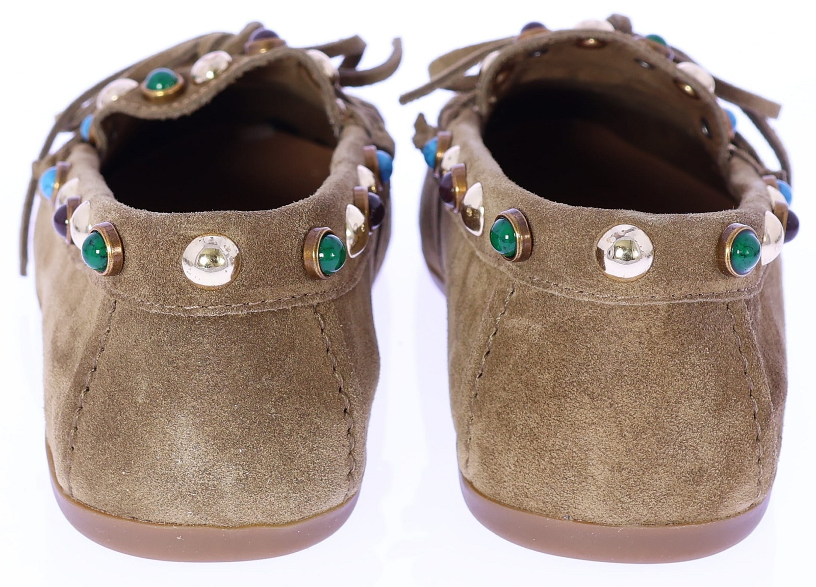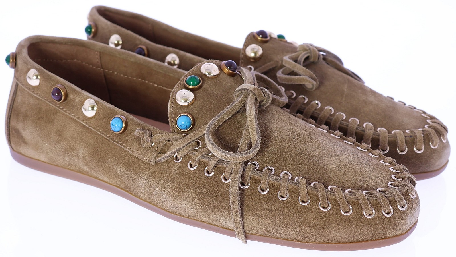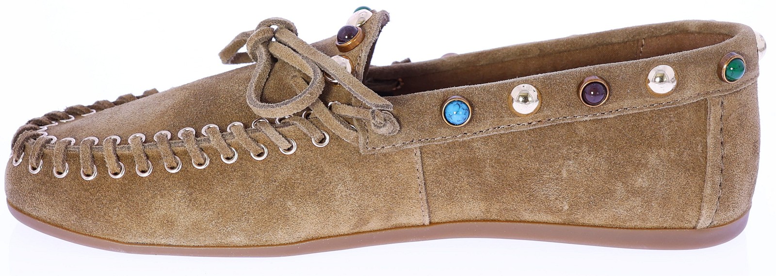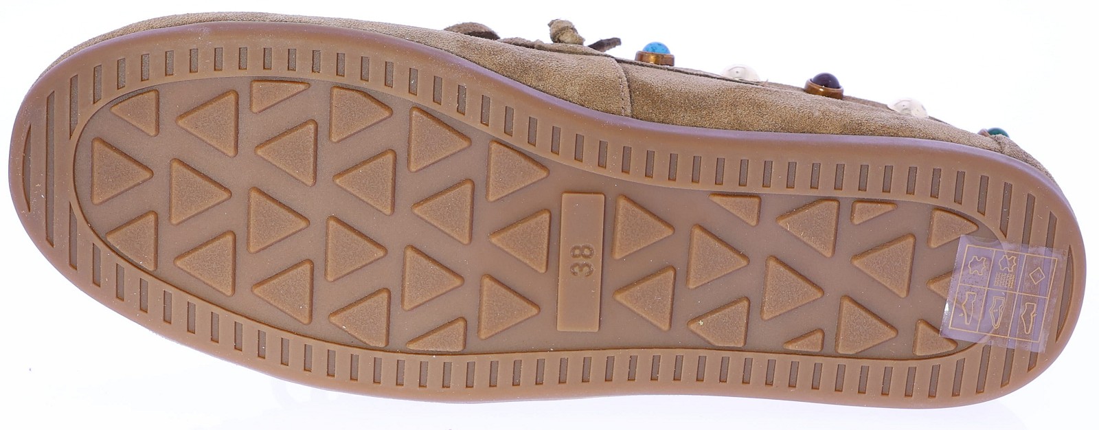Bruin suède dames instappers van Miss Behave. Model Zelin is een modieuze instapper met kleurrijke studs langs de rand en een grove mocassin-steek voor een speels effect. Het zachte suède vormt zich prettig naar de voet, terwijl de flexibele rubberen zool comfortabel meebeweegt tijdens het lopen. Een eigentijdse keuze die perfect past bij de trend van dit moment. Ontdek ook de andere dames instappers van Miss Behave bij Klijsen.