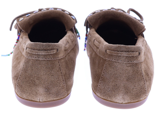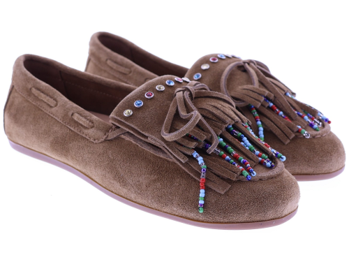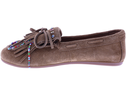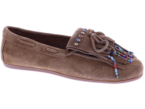 Bruin suède dames instappers van Miss Behave. Model Zeno valt op door de vrolijke kralen op de franjes en de gekleurde studs op de voorvoet. Het zachte suède zorgt voor een comfortabele pasvorm, terwijl de flexibele rubberen zool soepel meebeweegt bij elke stap. Een speelse en modieuze instapper die perfect past bij de trends van dit seizoen. Ontdek ook de andere dames instappers van Miss Behave bij Klijsen.