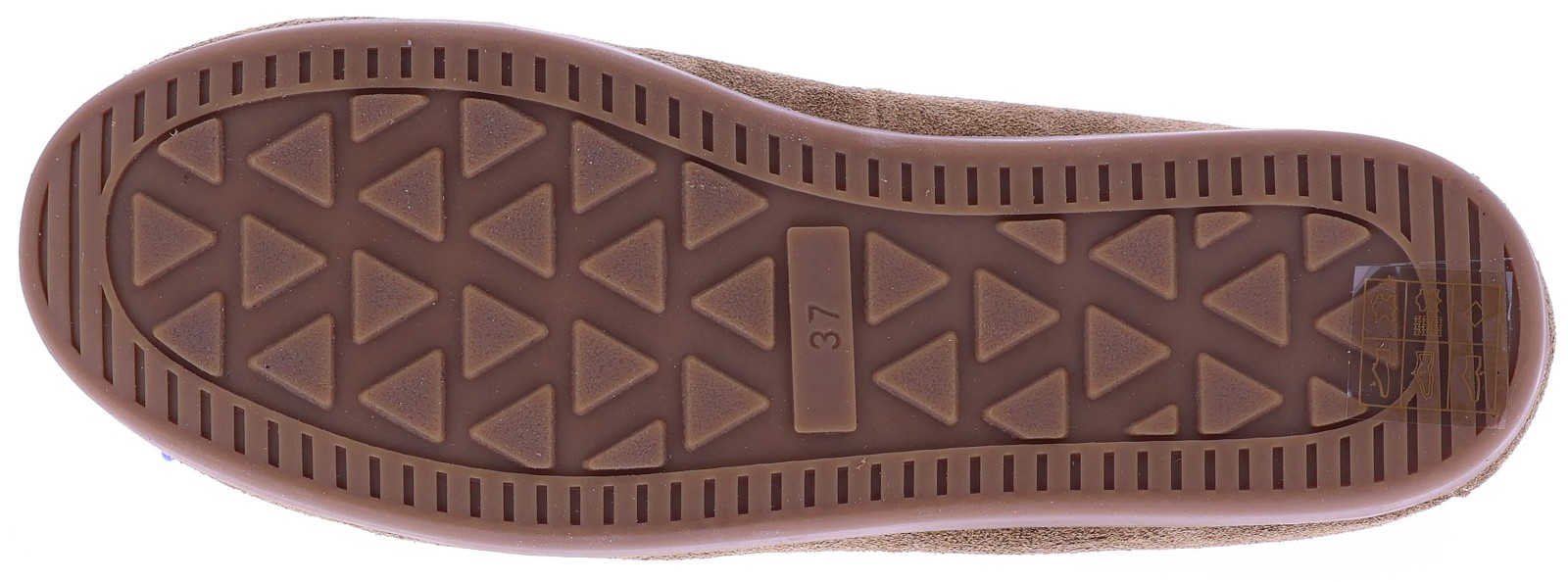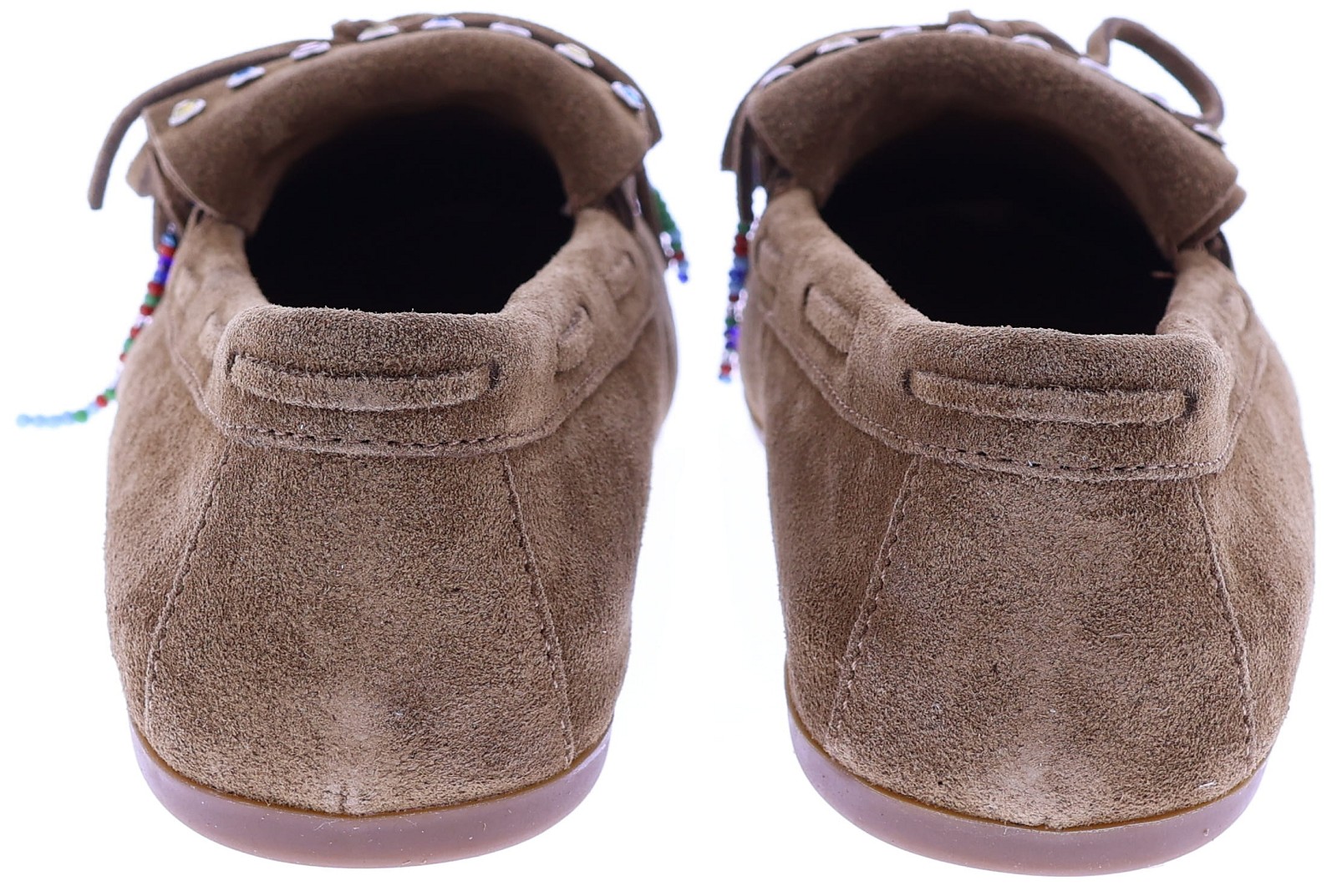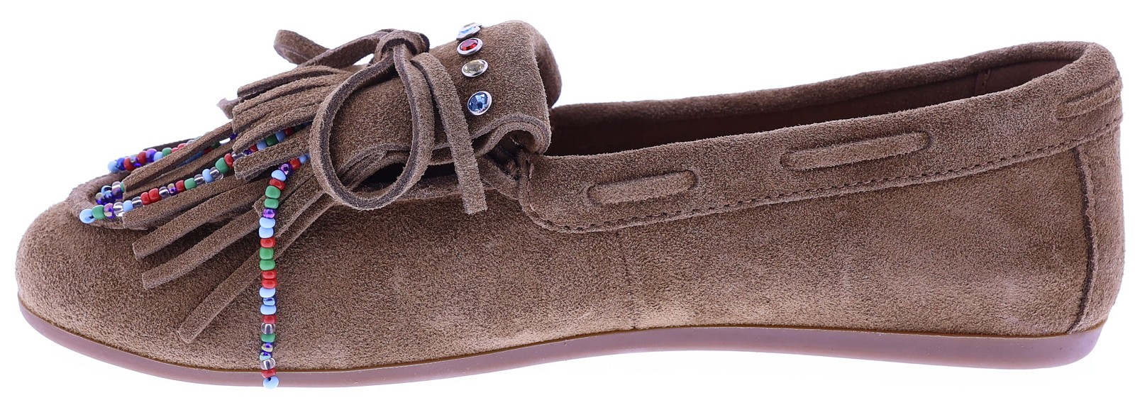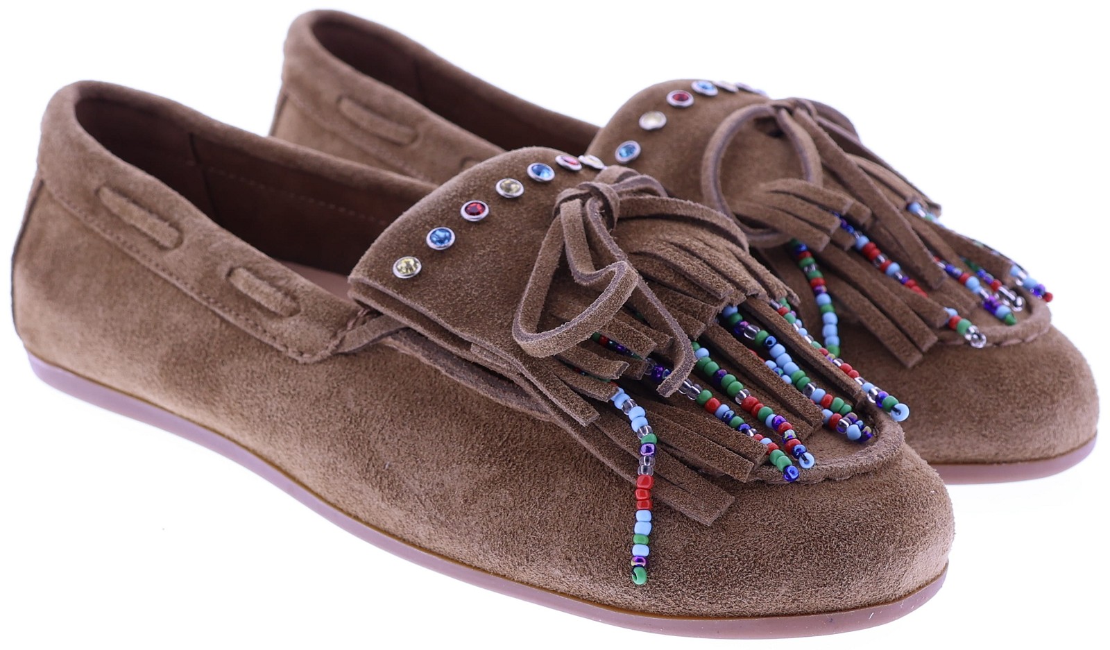 Bruin suède dames instappers van Miss Behave. Model Zeno valt op door de vrolijke kralen op de franjes en de gekleurde studs op de voorvoet. Het zachte suède zorgt voor een comfortabele pasvorm, terwijl de flexibele rubberen zool soepel meebeweegt bij elke stap. Een speelse en modieuze instapper die perfect past bij de trends van dit seizoen. Ontdek ook de andere dames instappers van Miss Behave bij Klijsen.