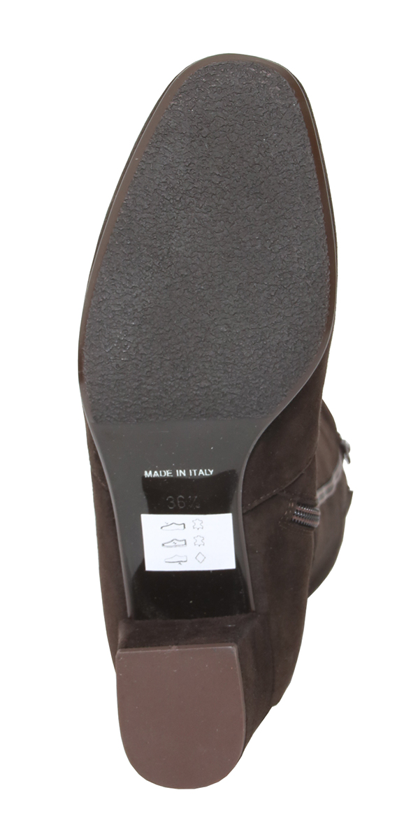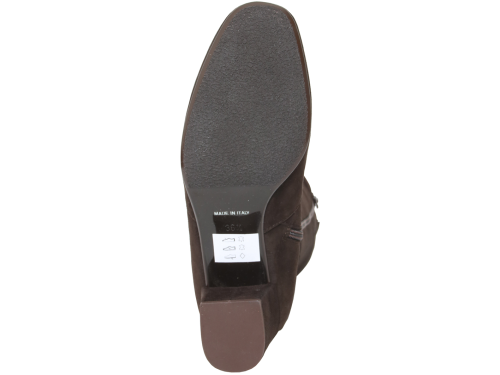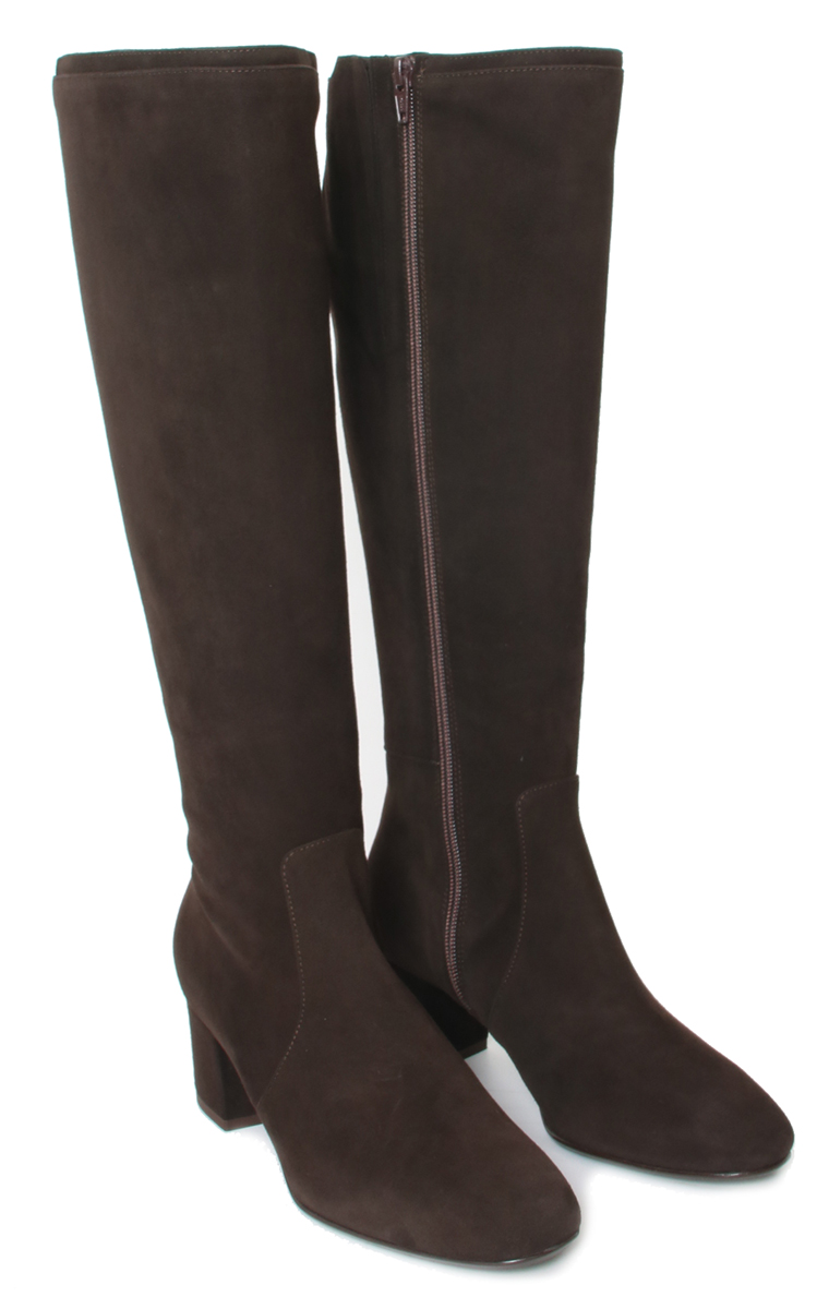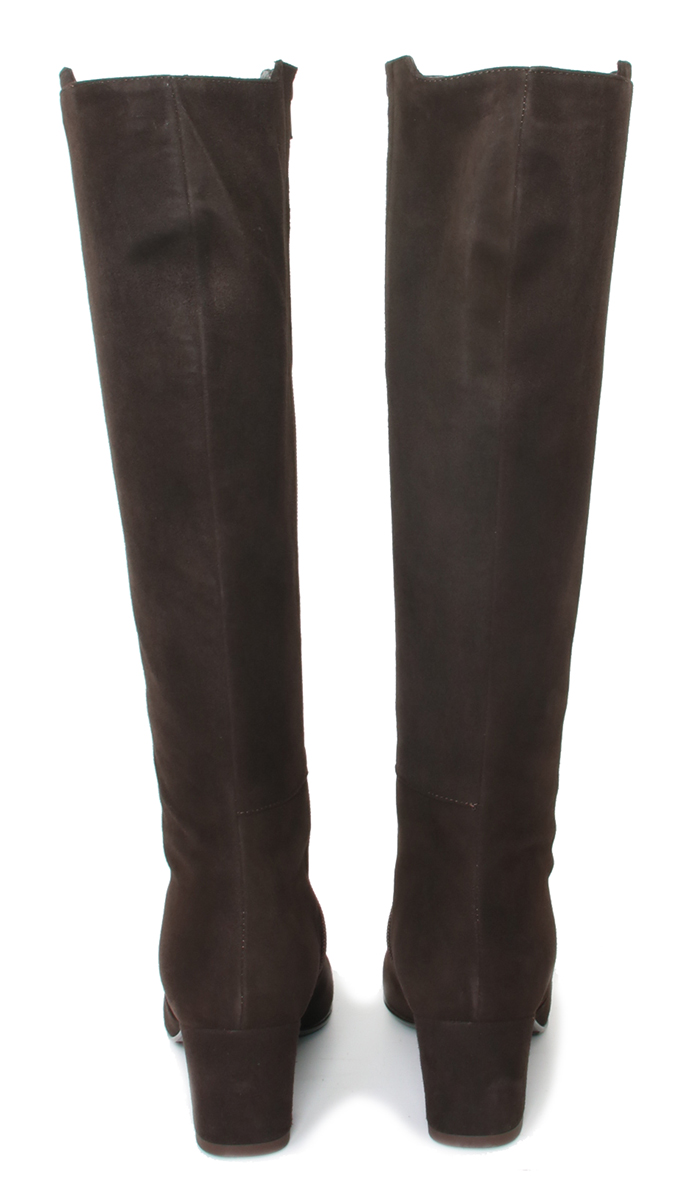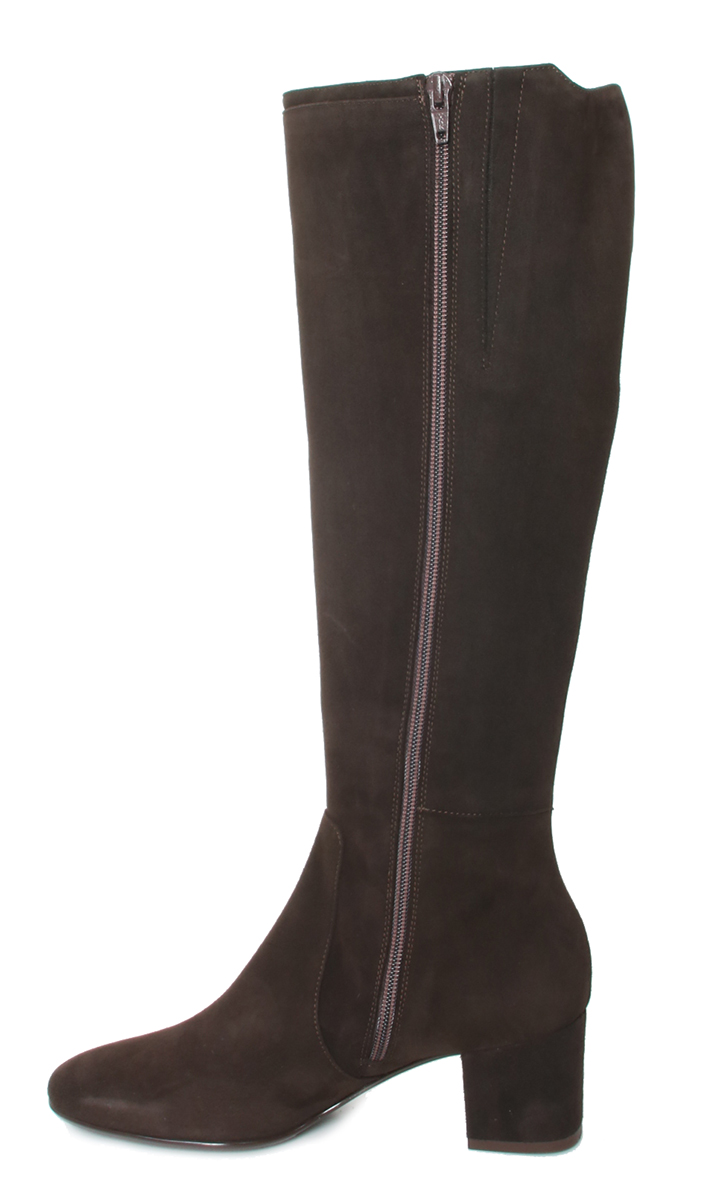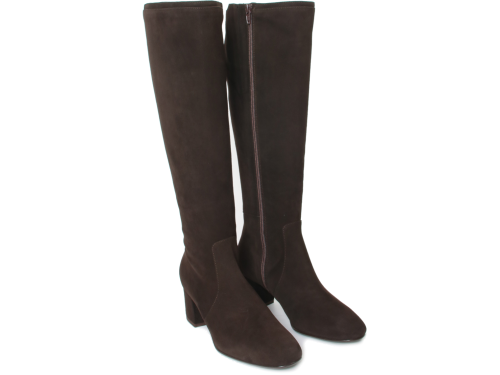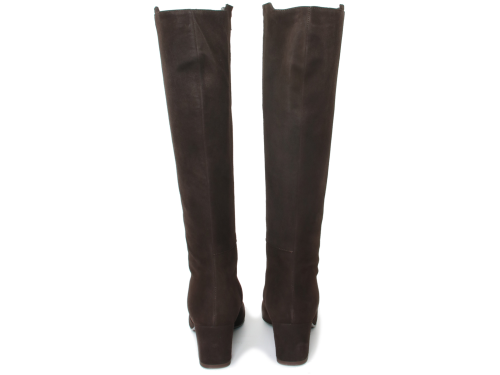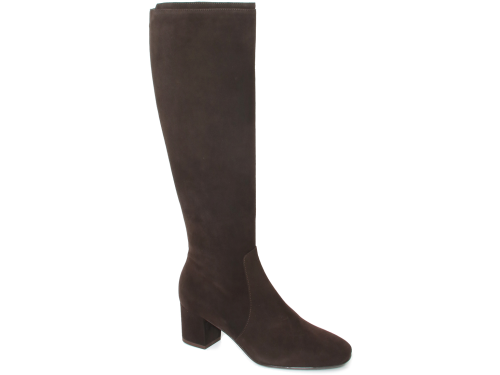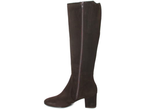 Donkerbruin suede dames laars van Nalini. Mooie elegante basislaars met een XL-schacht. Dit betekent dat de laars geschikt is voor een voller been. De laars heeft een hak van 5 cm en een leren voering.