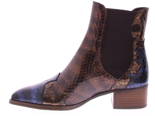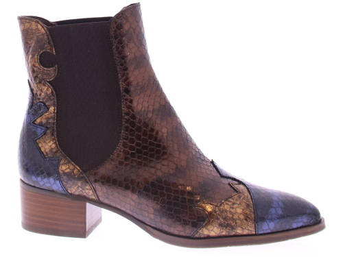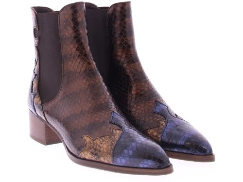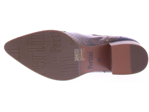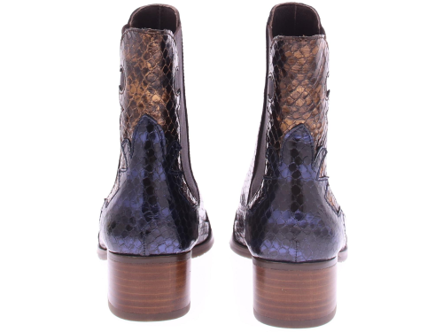 Blauw met brons en blauw suede dames laars van het merk Pertini. Deze enkellaars is uitgevoerd in suede met een voorkant van lakleer en heeft een slangenprint met vlam accenten. Dankzij de elastische zijpanelen trek je ’m gemakkelijk aan en uit en geeft het de laars een finishing touch! De voering is gemaakt van leer en heeft een vast voetbed. De hak heeft een hoogte van ruim 4 centimeter en de zool is afgewerkt met een rubber ribbeltjesprofiel voor voldoende grip.