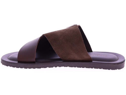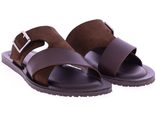 Bruin leren heren slipper van The Sandals Factory. Deze M8101 is uitgevoerd in een stijlvolle combinatie van zacht suède en soepel leer voor een luxe, zomerse uitstraling. De brede gekruiste band zorgt voor een stevige pasvorm, terwijl de verstelbare suède band met gesp extra zekerheid en comfort biedt. Het zacht gevoerde voetbed voelt aangenaam aan bij elke stap, en de flexibele zool geeft goede grip tijdens dagelijks gebruik. Ontdek ook de andere heren slippers van The Sandals Factory bij Klijsen.