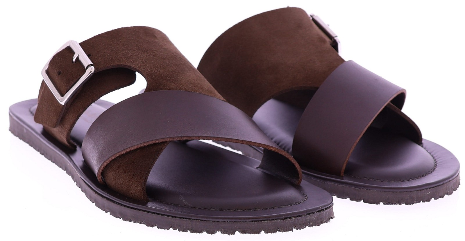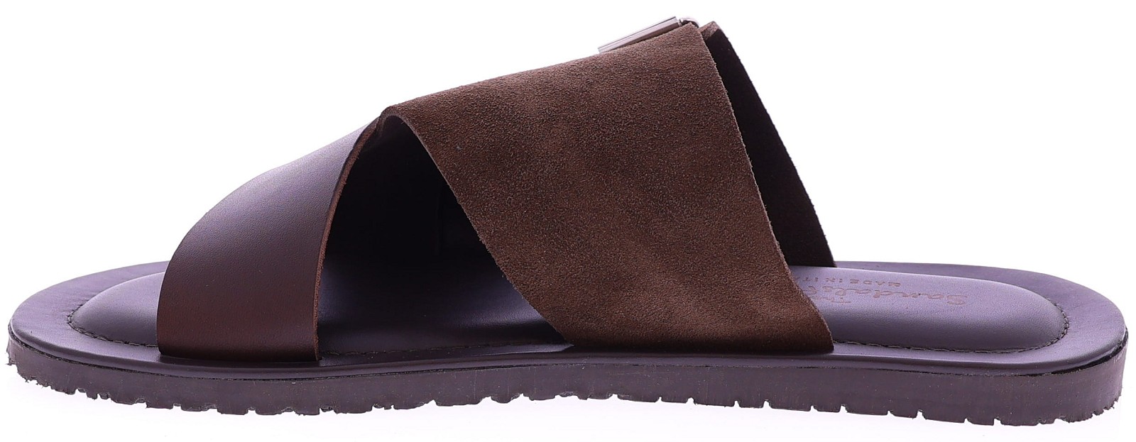 Bruin leren heren slipper van The Sandals Factory. Deze M8101 is uitgevoerd in een stijlvolle combinatie van zacht suède en soepel leer voor een luxe, zomerse uitstraling. De brede gekruiste band zorgt voor een stevige pasvorm, terwijl de verstelbare suède band met gesp extra zekerheid en comfort biedt. Het zacht gevoerde voetbed voelt aangenaam aan bij elke stap, en de flexibele zool geeft goede grip tijdens dagelijks gebruik. Ontdek ook de andere heren slippers van The Sandals Factory bij Klijsen.