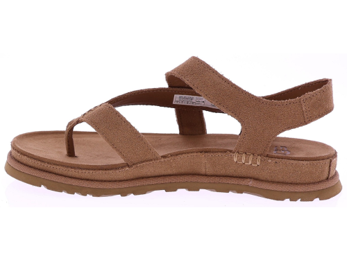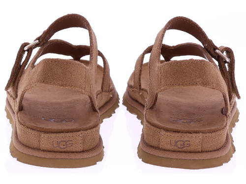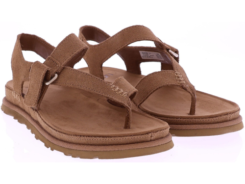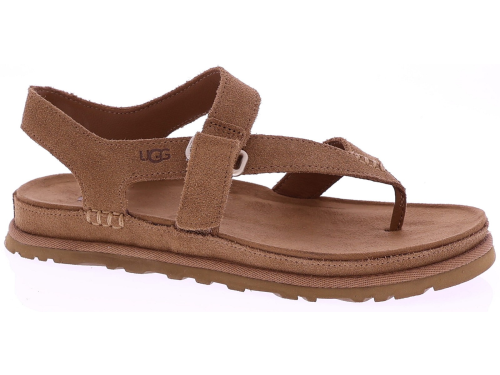 Middenbruin suède dames slippers van UGG, model Goldengaze Toe Post. Deze comfortabele teenslipper is uitgevoerd met een zacht suède bovenwerk en een stevige maar lichte zool die prettig meeloopt. De klittenband sluiting zorgt voor een goede pasvorm. Ideaal voor warme dagen, zowel thuis als onderweg. Mooi te combineren met een zomerse jurk of linnen broek. Kijk ook eens bij onze andere UGG damesschoenen bij Klijsen.