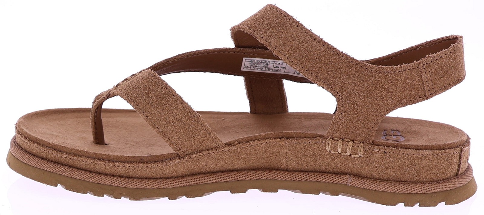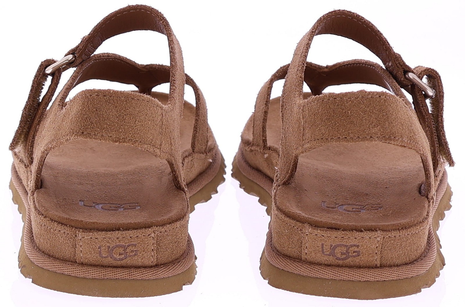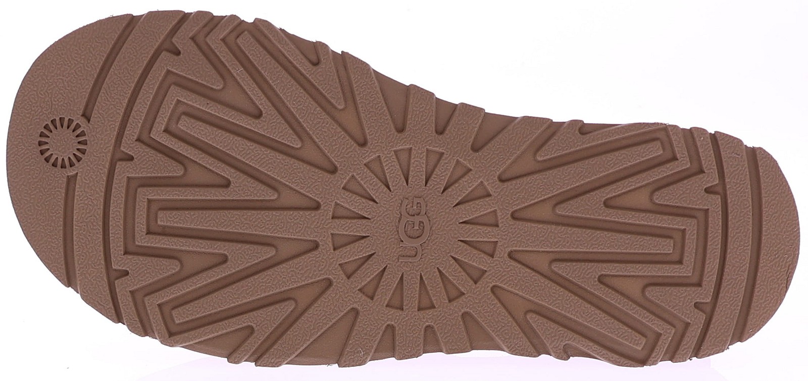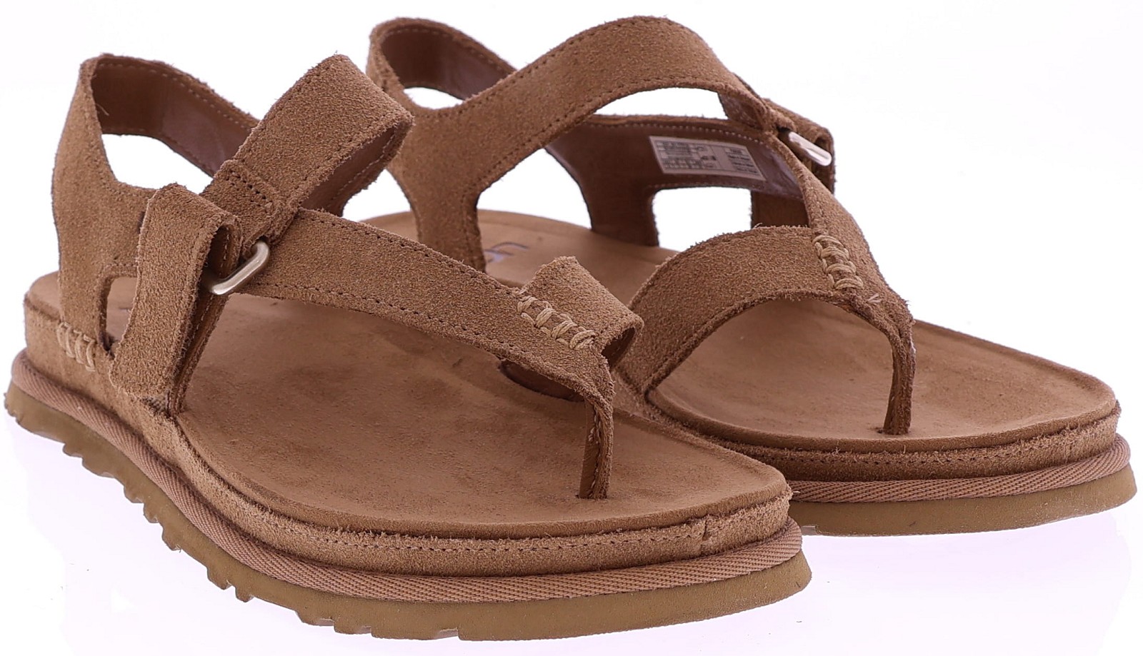 Middenbruin suède dames slippers van UGG, model Goldengaze Toe Post. Deze comfortabele teenslipper is uitgevoerd met een zacht suède bovenwerk en een stevige maar lichte zool die prettig meeloopt. De klittenband sluiting zorgt voor een goede pasvorm. Ideaal voor warme dagen, zowel thuis als onderweg. Mooi te combineren met een zomerse jurk of linnen broek. Kijk ook eens bij onze andere UGG damesschoenen bij Klijsen.