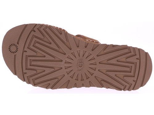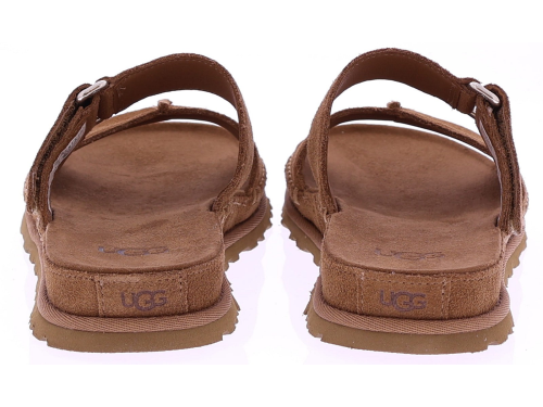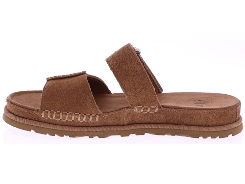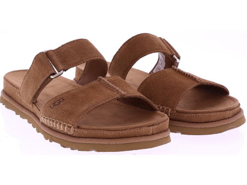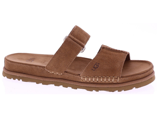 Bruin suède dames slippers van UGG, model Goldengaze Slide. Deze comfortabele slipper is uitgevoerd met twee verstelbare banden met klittenbandsluiting, waardoor hij eenvoudig aan te passen is aan de voet. Het zachte suède bovenwerk en de lichtgewicht zool zorgen voor een prettig draagcomfort, ideaal voor warme dagen of ontspannen momenten. Mooi te combineren met een zomerse outfit. Kijk ook eens bij onze andere UGG damesschoenen bij Klijsen.