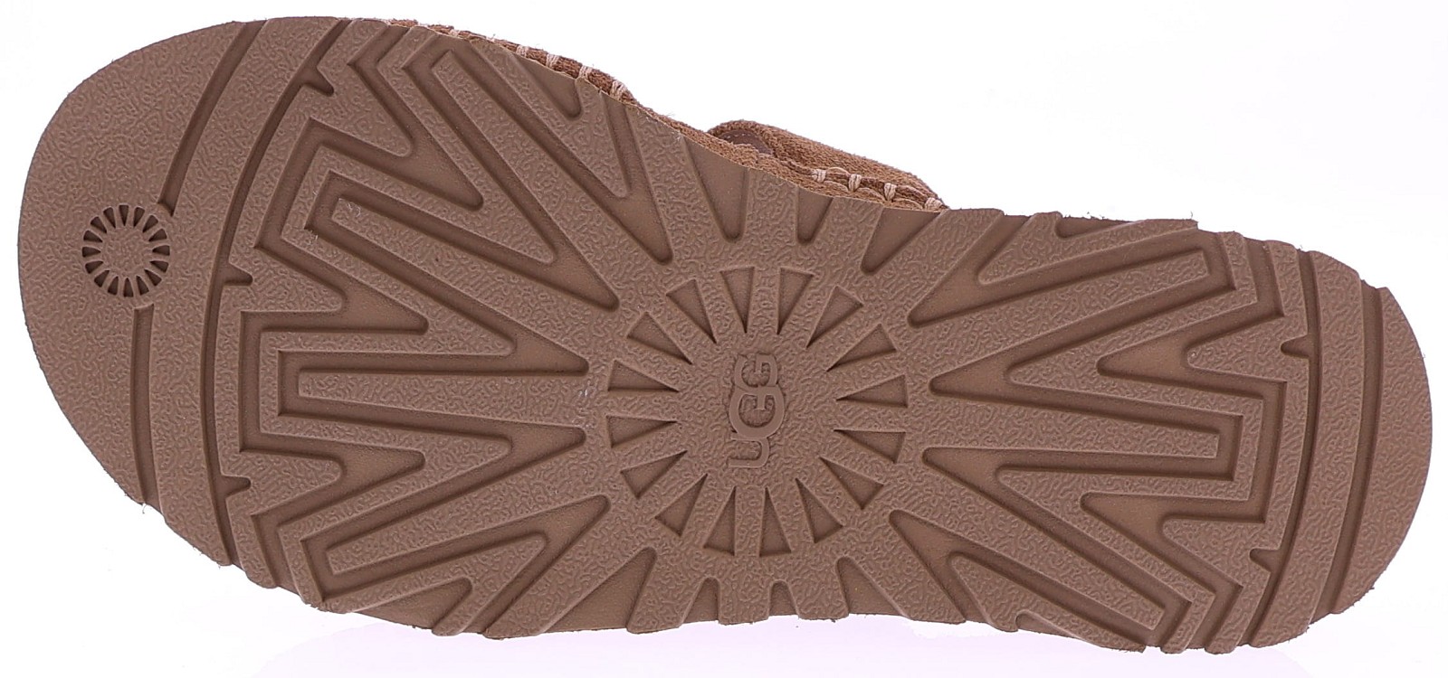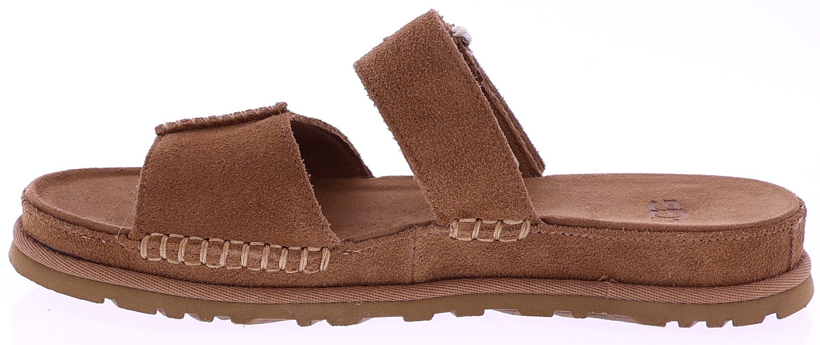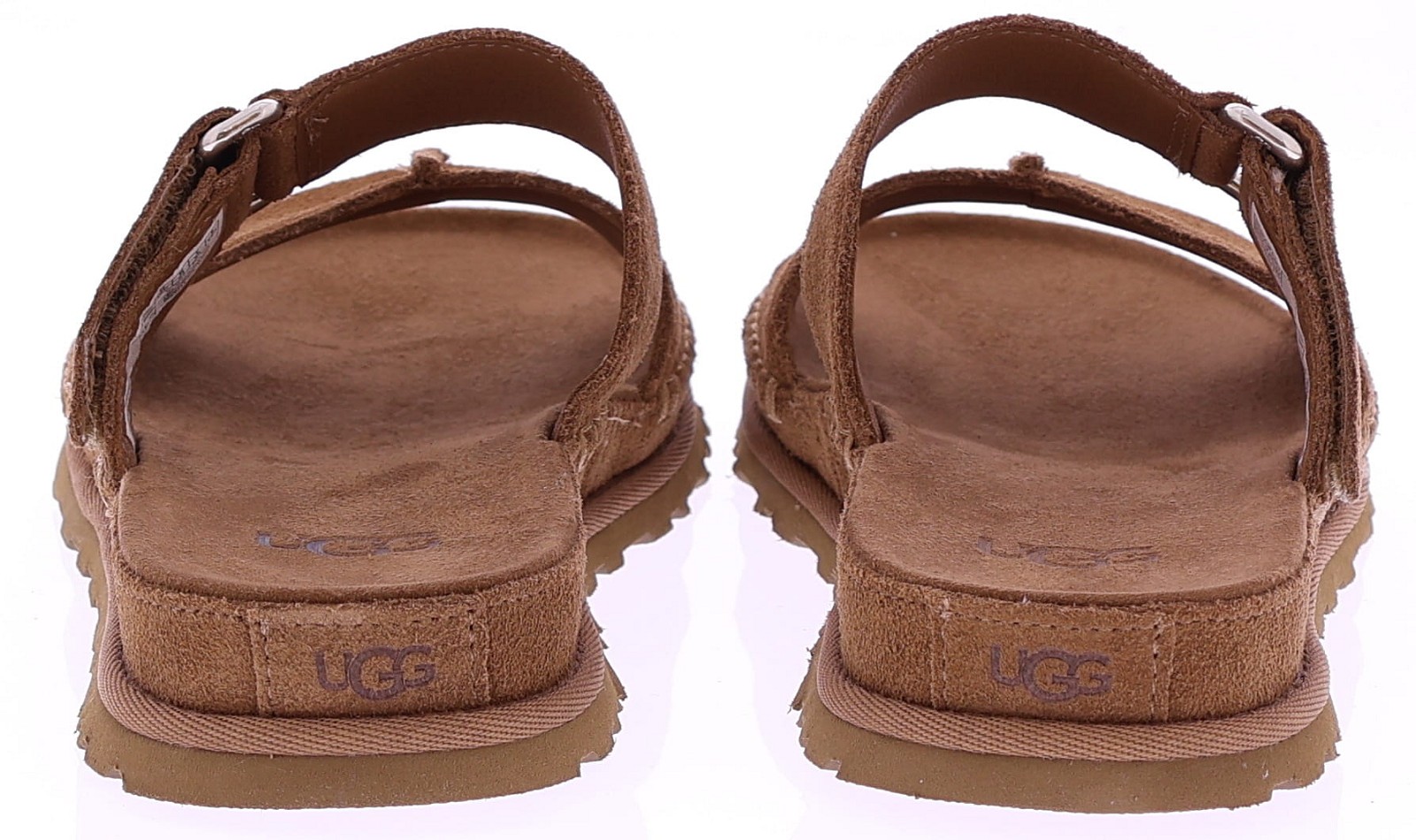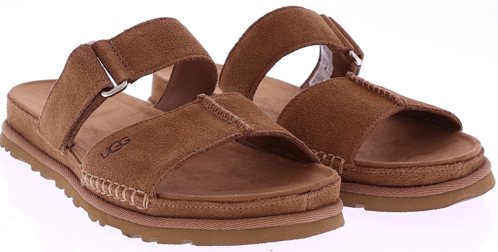 Bruin suède dames slippers van UGG, model Goldengaze Slide. Deze comfortabele slipper is uitgevoerd met twee verstelbare banden met klittenbandsluiting, waardoor hij eenvoudig aan te passen is aan de voet. Het zachte suède bovenwerk en de lichtgewicht zool zorgen voor een prettig draagcomfort, ideaal voor warme dagen of ontspannen momenten. Mooi te combineren met een zomerse outfit. Kijk ook eens bij onze andere UGG damesschoenen bij Klijsen.