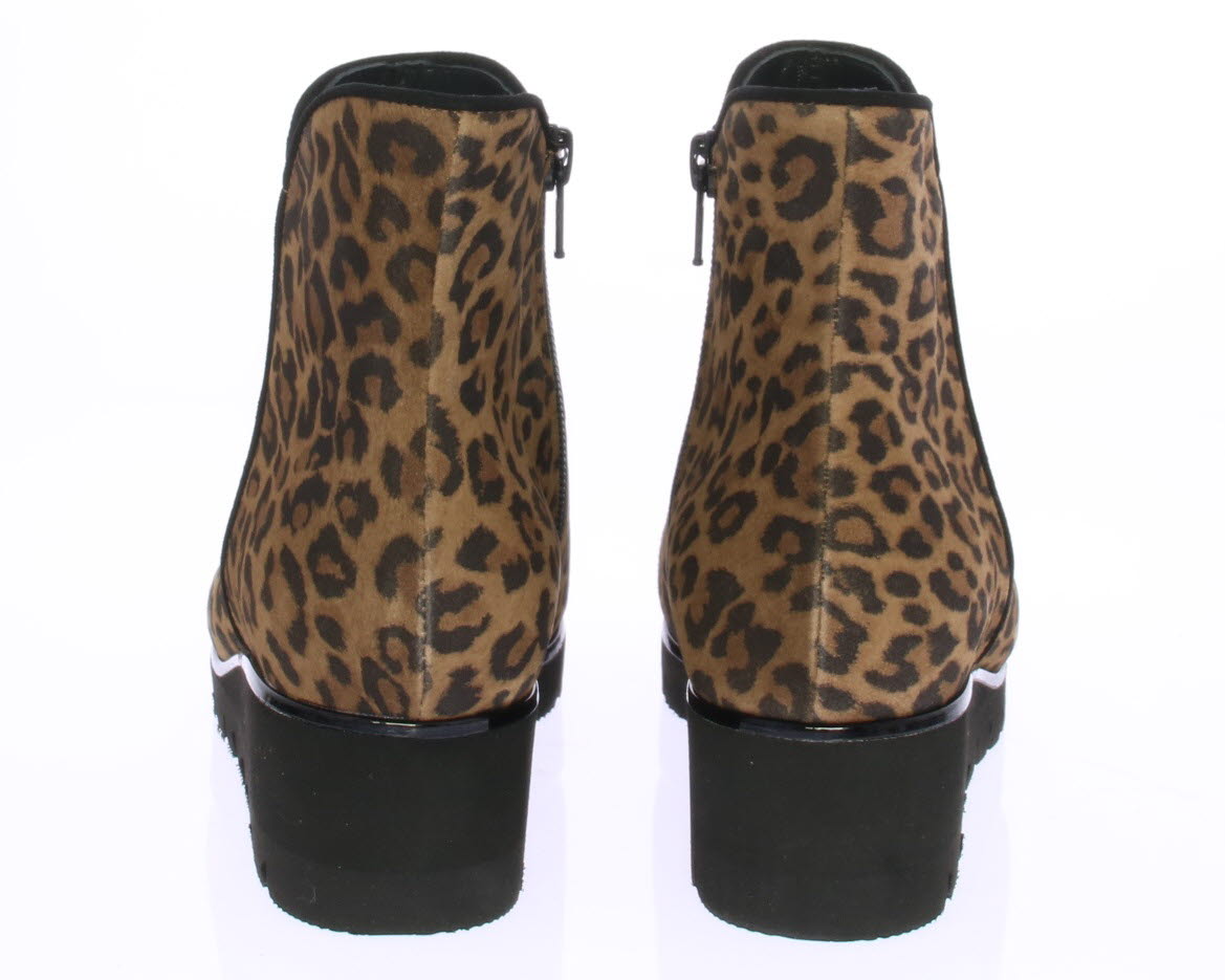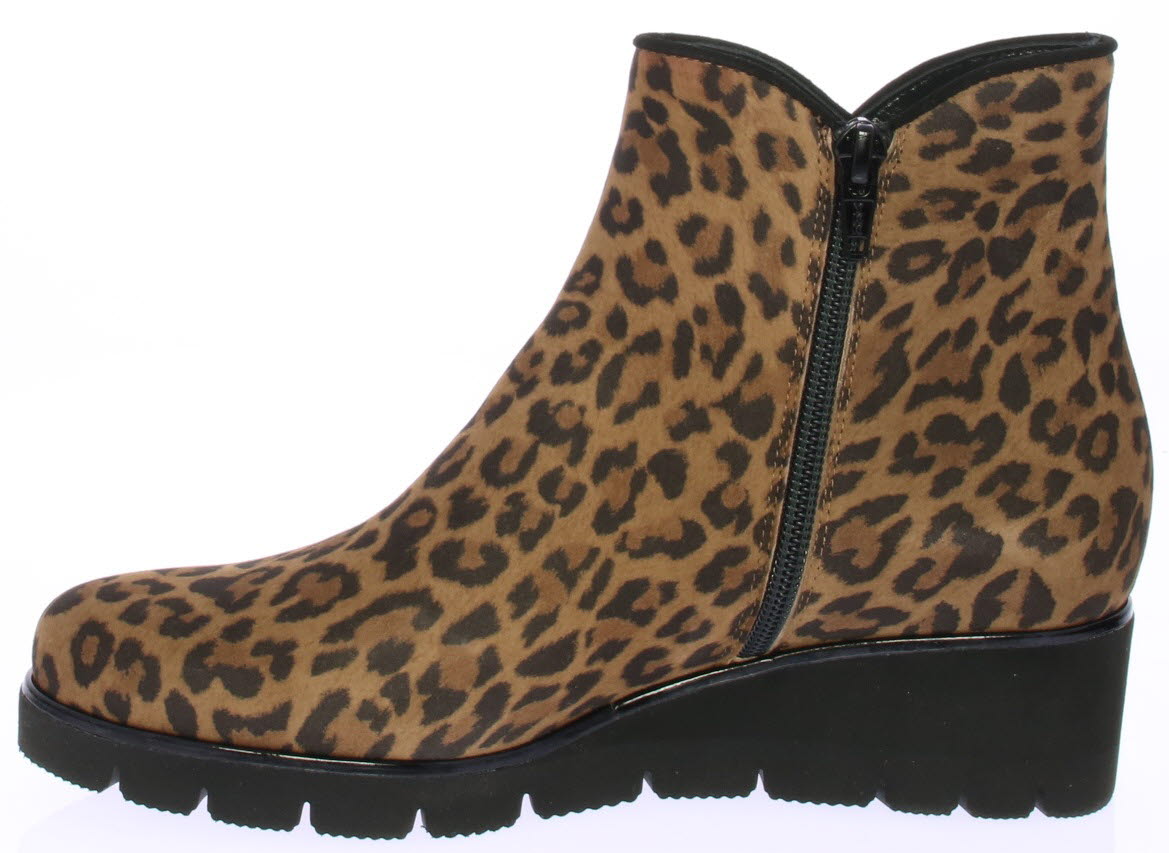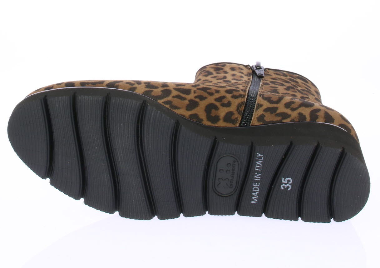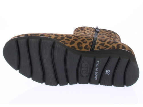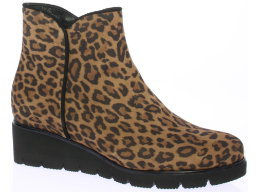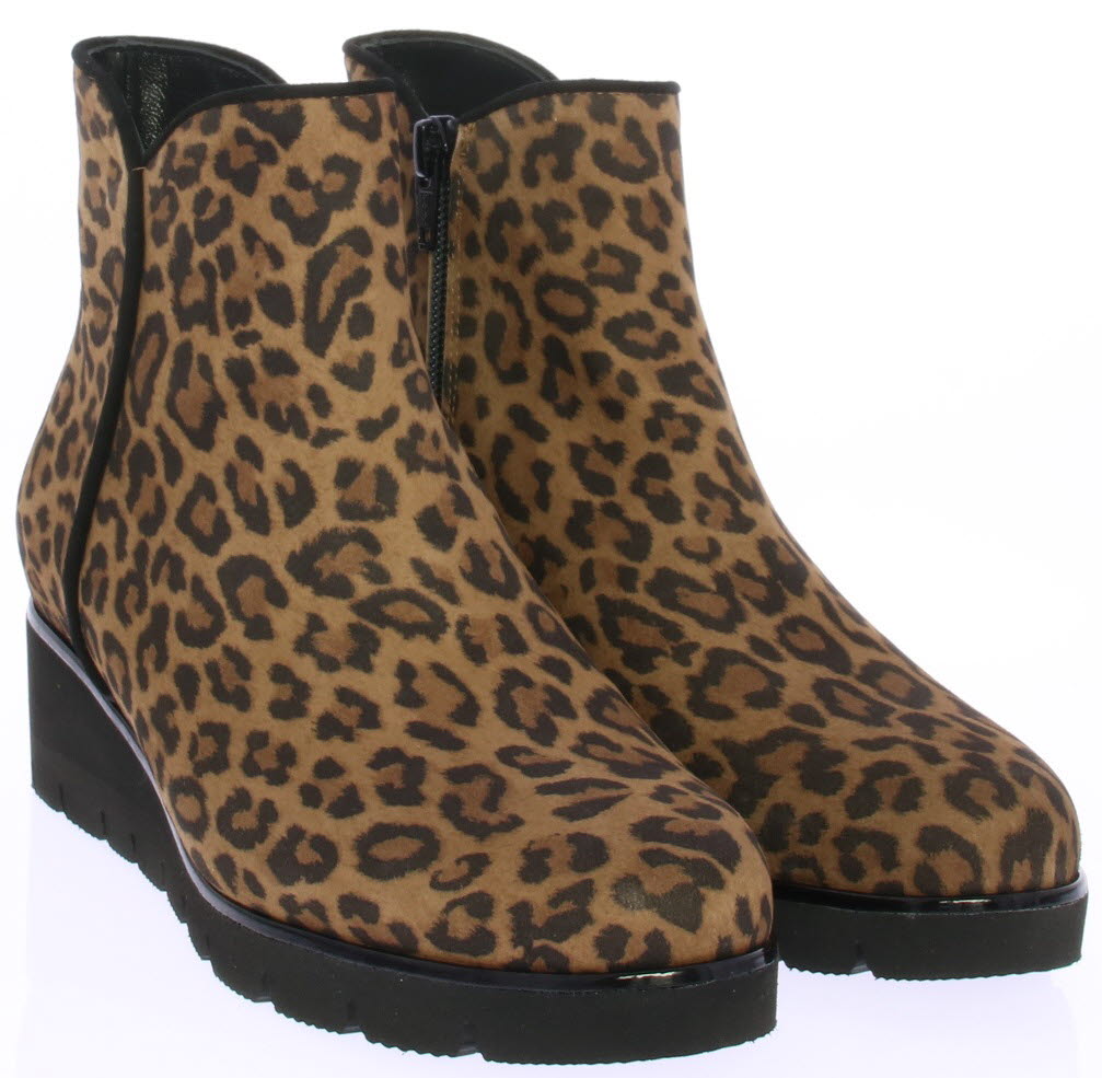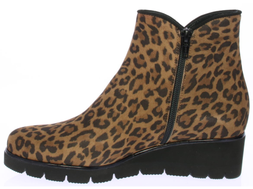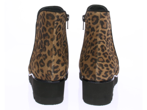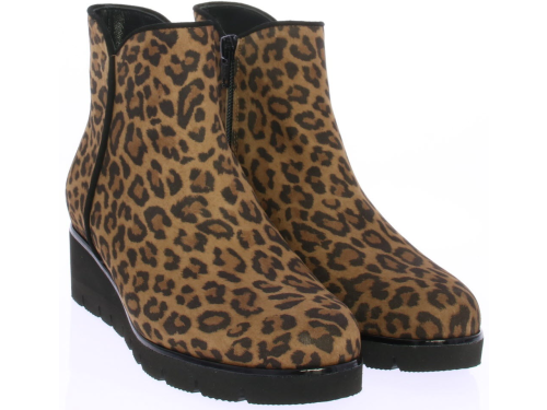 Luipaardprint suede dames enkellaars van Volare. De laars heeft een rubberen sleehak van ongeveer 3 cm voor extra draagcomfort en is voorzien van een uitneembaar voetbed zodat ook de eigen inlegzool erin geplaatst kan worden. De laars is gemaakt op een iets bredere leest.