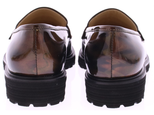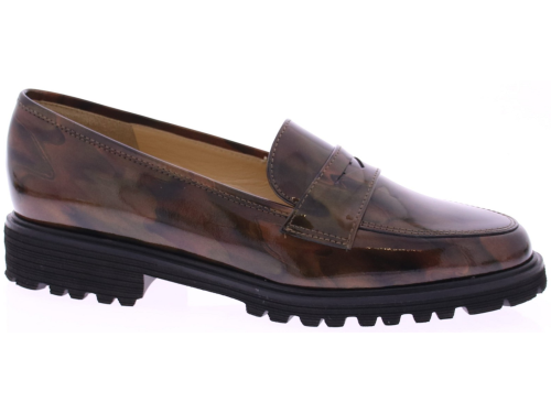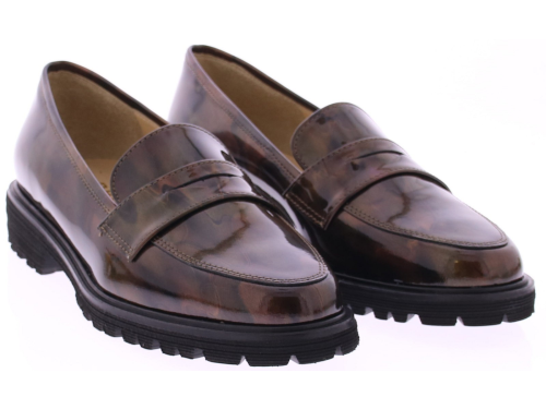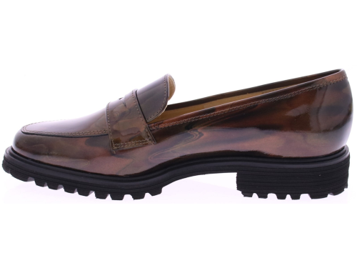 Donkerbruine lakleren dames instapper van Brunate. Deze loafers zijn uitgevoerd in extra zacht kalfslakleer met een print erin verwerkt. Ze hebben een zeer comfortabel voetbed en de zool is gemaakt van lichtgewicht rubber met een licht profiel.