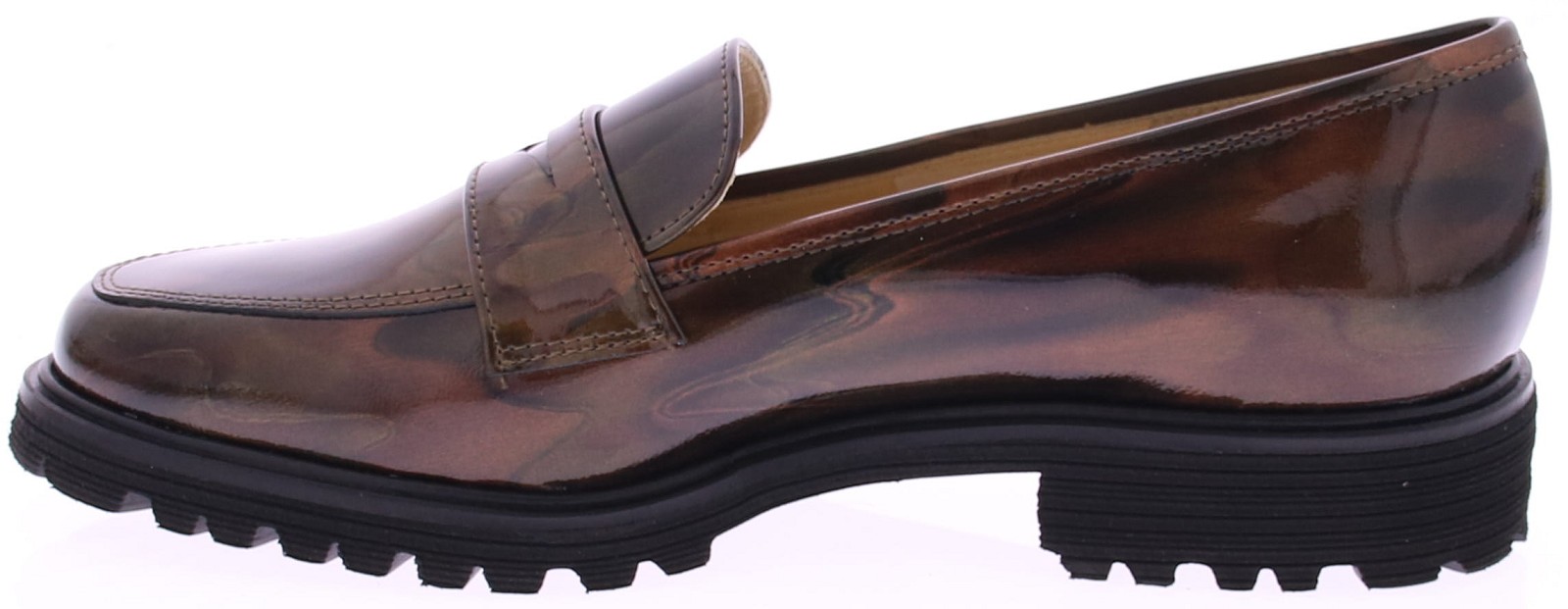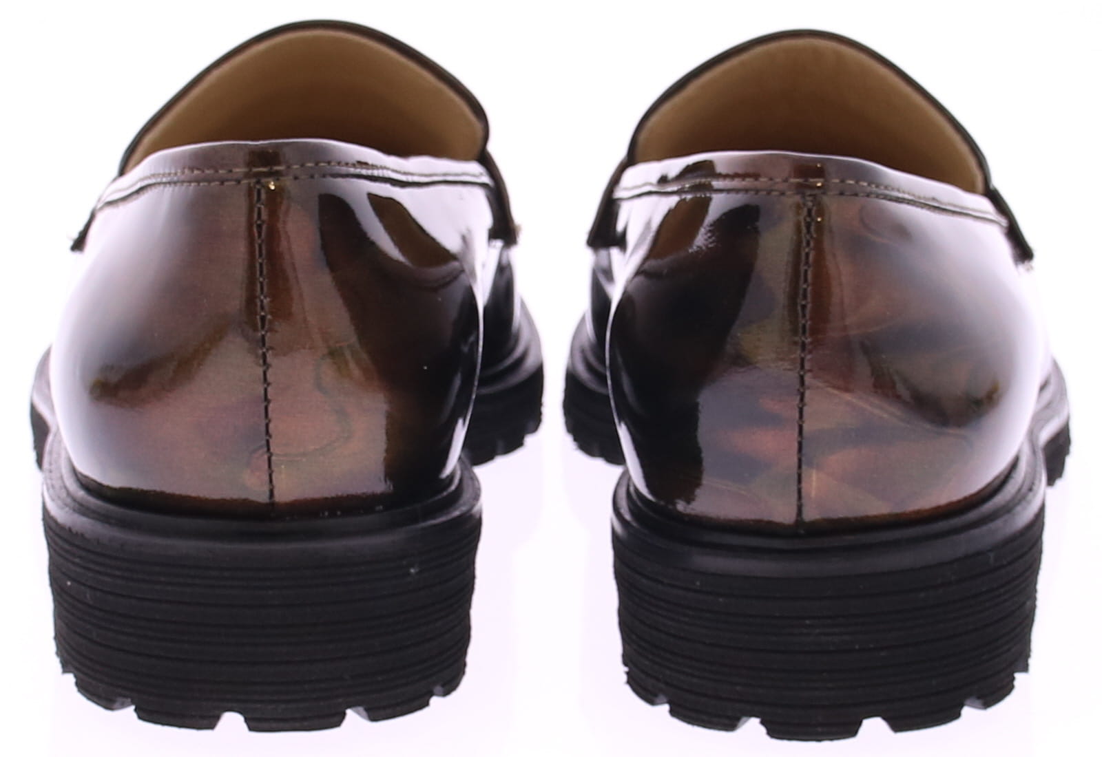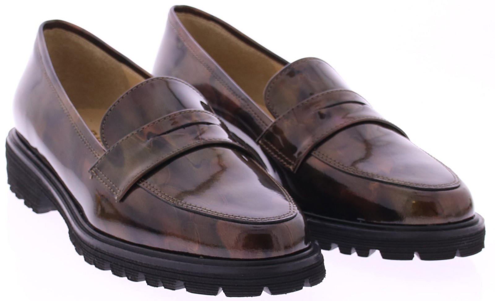 Donkerbruine lakleren dames instapper van Brunate. Deze loafers zijn uitgevoerd in extra zacht kalfslakleer met een print erin verwerkt. Ze hebben een zeer comfortabel voetbed en de zool is gemaakt van lichtgewicht rubber met een licht profiel.