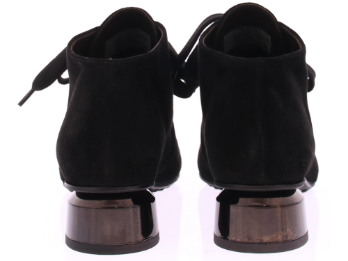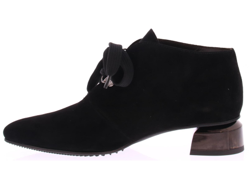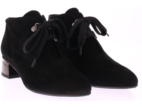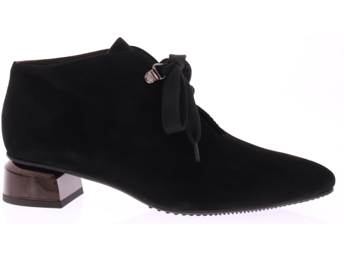 Zwart suede veterlaars van Brunate. Deze elegante, enkelhoge veterlaars is gemaakt op een spitsere leest met een 3 cm lakhakje in bronskleur en is voorzien van zilverkleurige veterhaakjes met een vlotte veter. Door de schachthoogte zijn ze mooi te combineren onder zowel broek als rok of jurkje. Het Italiaanse Brunate staat bekend om zijn goede pasvorm en mooie materialen.