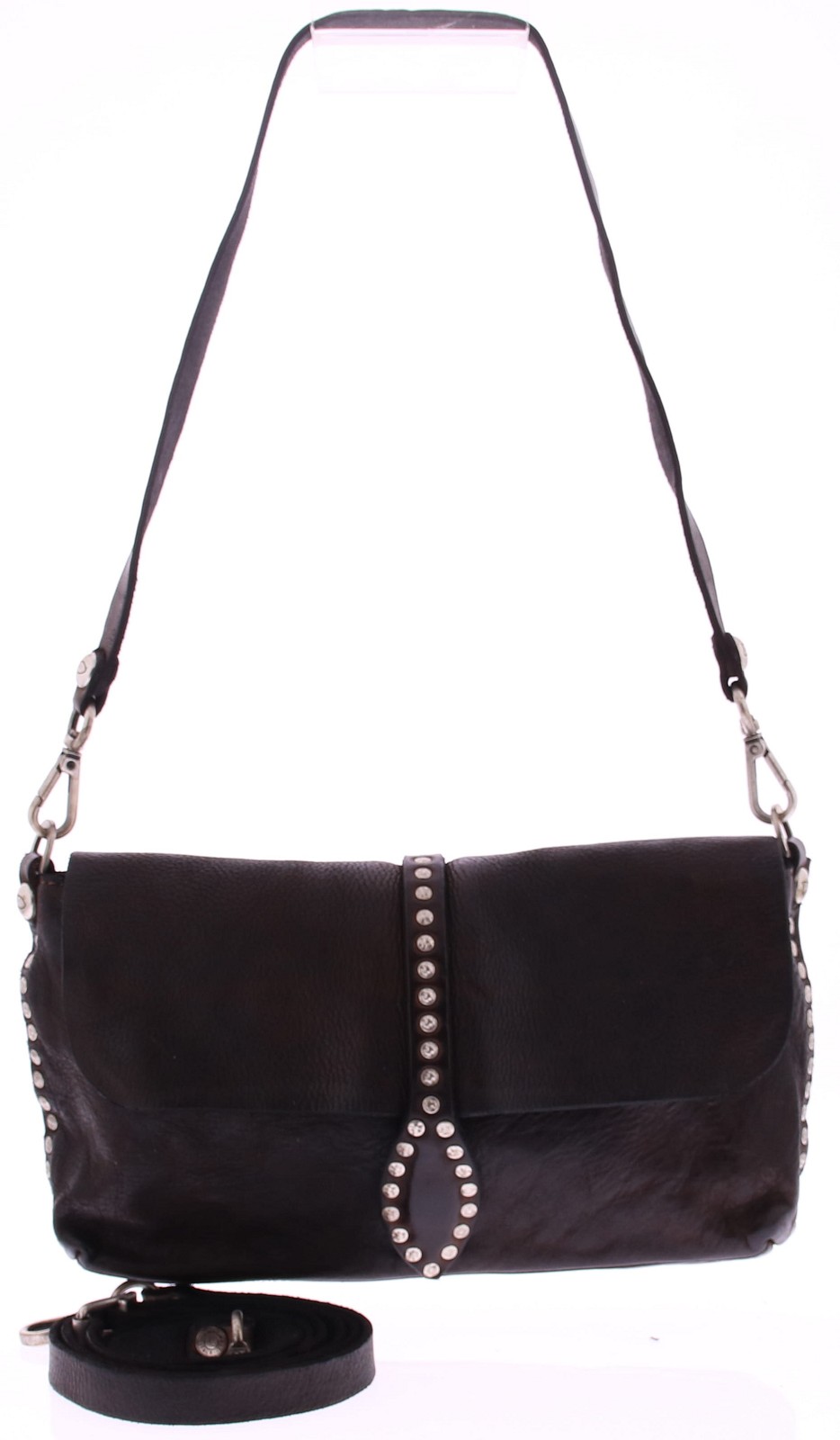 Ervaar het beste van Italiaans design met deze exclusieve leren dames tas van Campomaggi in donkerbruin, handgemaakt in Italië van 100% natuurlijk geverfd rundleer, Deze compacte tas in combinatie met het decoratieve profiel van metalen studs geeft de tas een unieke en karaktervolle uitstraling. De binnenkant is volledig gevoerd en beschikt over één ruim hoofdvak en een praktisch afsluitbaar binnenvak ideaal voor het veilig opbergen van je essentials zoals telefoon, sleutels of make-up. Dankzij de magnetische drukknopsluiting is je tas in een handomdraai geopend of gesloten. De tas is uitgerust met een verstelbare en afneembare schouderriem, zodat je haar zowel als crossbody of clutch kunt dragen – perfect voor elke gelegenheid, van een dagje shoppen tot een chique avond uit. Formaat van de tas B23 x D5 x H13 cm. Elke tas wordt geleverd met een bijpassende katoenen stofzak en een verzorging set, zodat het leer zijn unieke uitstraling behoudt en met de jaren alleen maar mooier wordt.