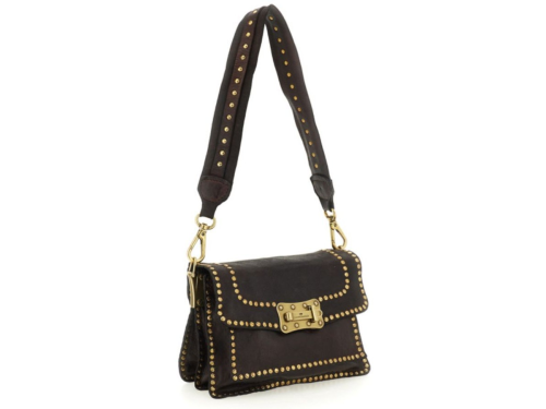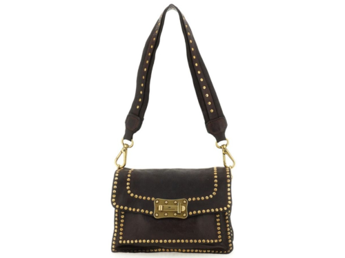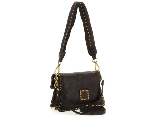 Donkerbruine leren dames tas van Campomaggi. Deze tas is gemaakt van natuurlijk gelooid leer, wat duurzamer is en bovendien mooier wordt naarmate de tas ouder wordt. Deze tas is rondom de zijkanten bekleed met gouden studs. Deze tas kan goed als heup- of schoudertas gedragen worden en komt met een verstelbare schouderband.