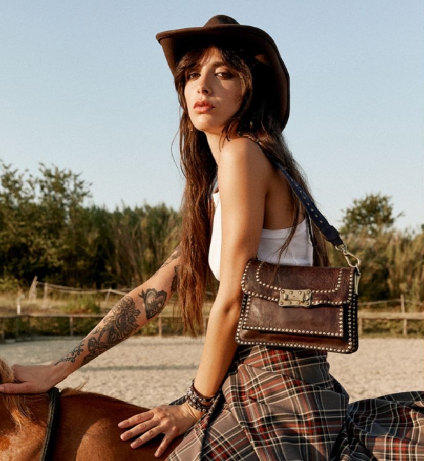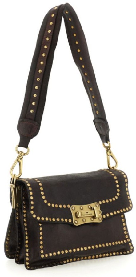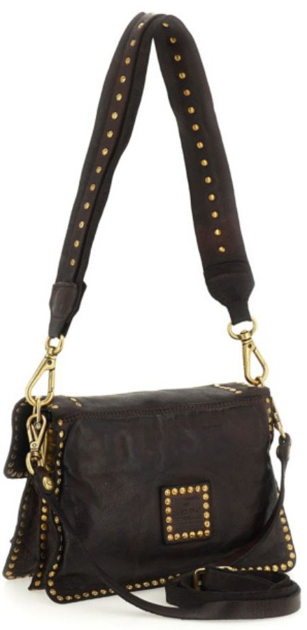 Donkerbruine leren dames tas van Campomaggi. Deze tas is gemaakt van natuurlijk gelooid leer, wat duurzamer is en bovendien mooier wordt naarmate de tas ouder wordt. Deze tas is rondom de zijkanten bekleed met gouden studs. Deze tas kan goed als heup- of schoudertas gedragen worden en komt met een verstelbare schouderband.