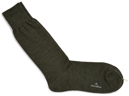 Donker groene wollen heren sok van Carlo Lanza. Deze exclusieve heren sok is gemaakt van 70% wol en 30% polyamide. De sokken komen uit een klein atelier in Italië en zijn door Carlo Lanza verder aangepast en verfijnt qua pasvorm, uitstraling en kleur.