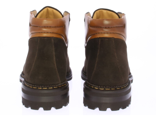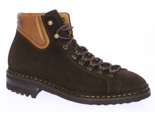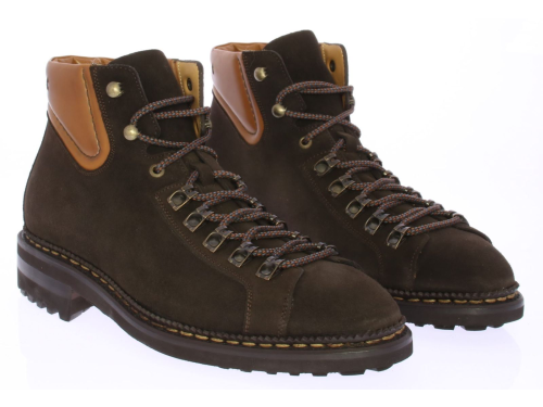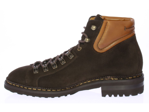 Gevet donkerbruin suede heren bergschoen van Carlos Santos uitgevoerd met en cognac leren manchet. De schoen is goodyear gemaakt op een licht gewicht zool voor maximale duurzaamheid. De schoen is rondom langs de zool met de hand afgestikt.