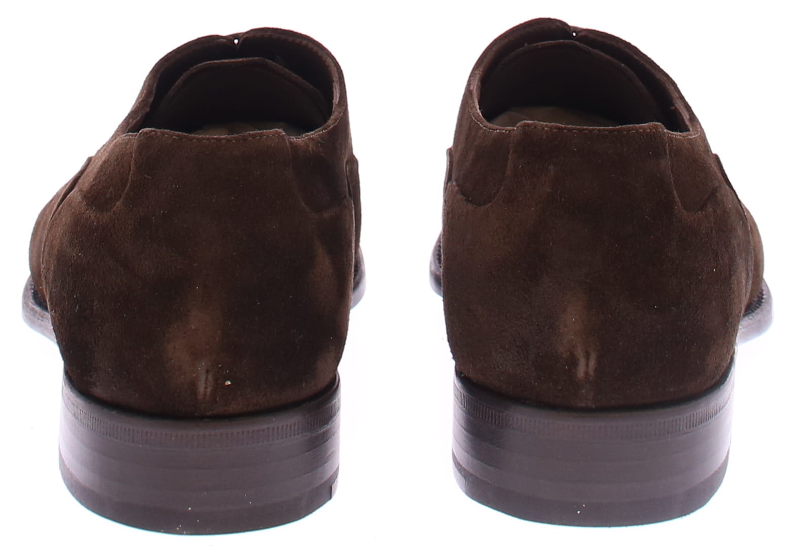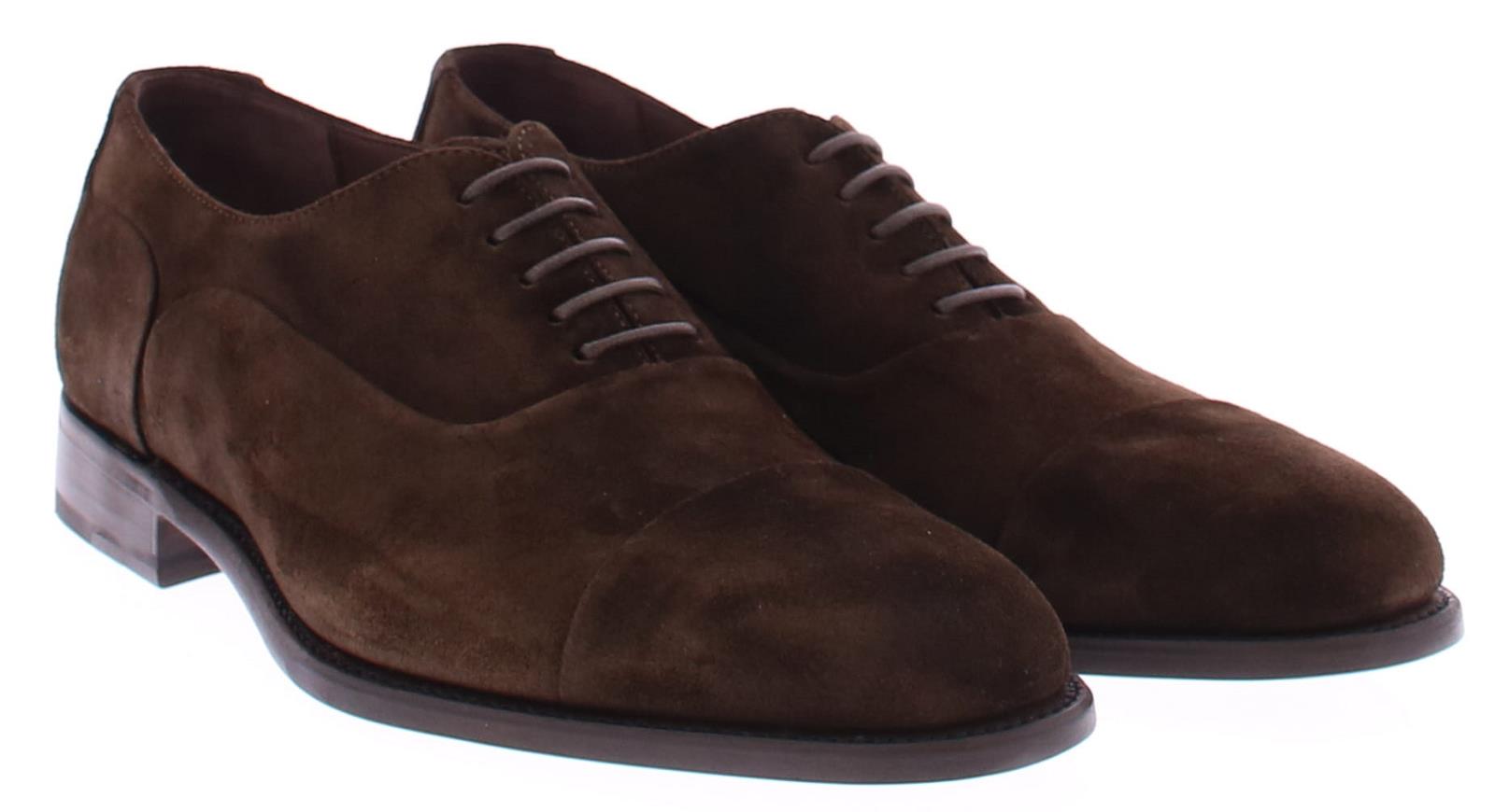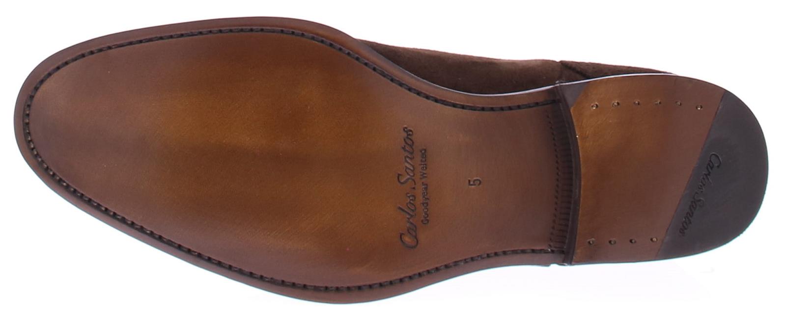 Donkerbruin suede heren veterschoen van Carlos Santos. Deze veterschoen komt op een leren zool en heeft een leren binnenvoering. Over de neus van de schoen loopt een stiknaad.