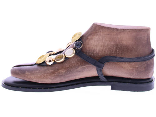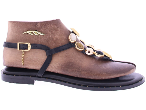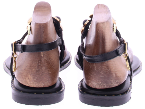Zwart leren dames sandaal van Caryatis. Deze elegante sandaal is rijkelijk versierd met gekleurde stenen en accenten in gehamerd goud, wat zorgt voor een luxe en vrouwelijke uitstraling. De gouden gespjes maken het model verstelbaar en comfortabel, terwijl het zachte voetbed en de gouden spijkerkopjes in de zoolrand zorgen voor een verfijnde afwerking. Een stijlvolle keuze voor zomerse gelegenheden. Ontdek ook de andere dames sandalen van Caryatis bij Klijsen.