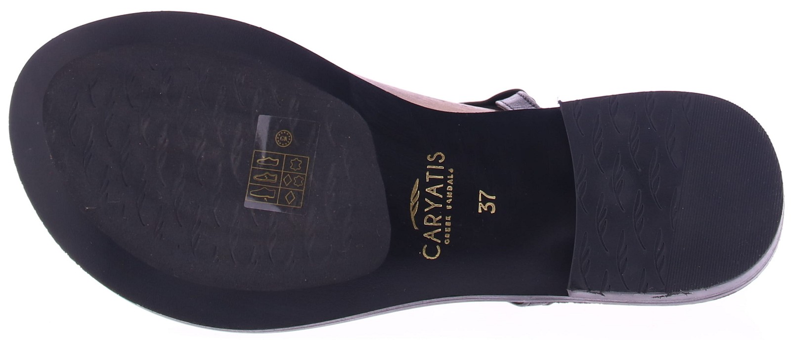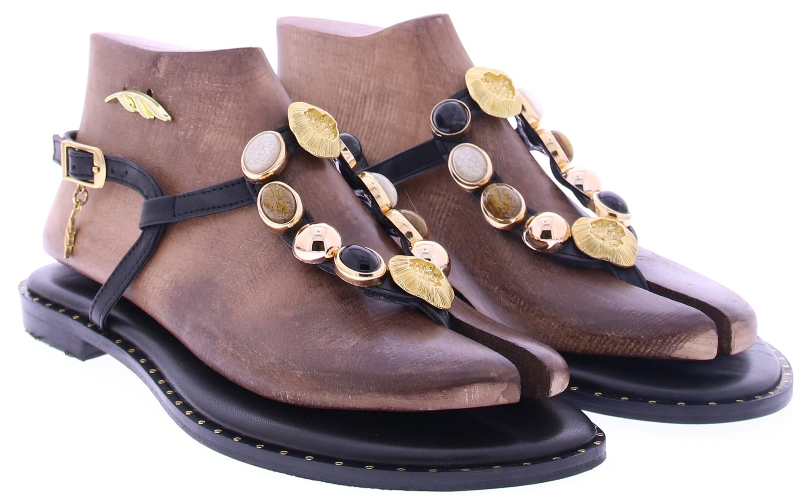 Zwart leren dames sandaal van Caryatis. Deze elegante sandaal is rijkelijk versierd met gekleurde stenen en accenten in gehamerd goud, wat zorgt voor een luxe en vrouwelijke uitstraling. De gouden gespjes maken het model verstelbaar en comfortabel, terwijl het zachte voetbed en de gouden spijkerkopjes in de zoolrand zorgen voor een verfijnde afwerking. Een stijlvolle keuze voor zomerse gelegenheden. Ontdek ook de andere dames sandalen van Caryatis bij Klijsen.
