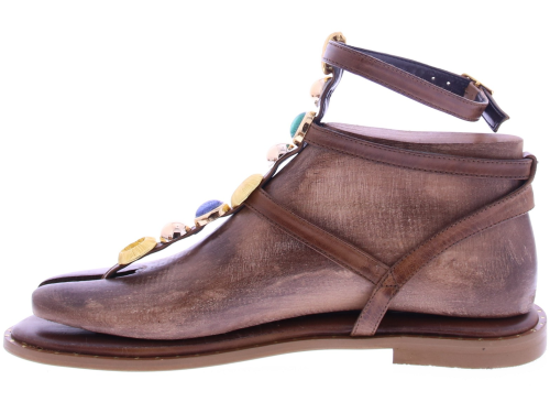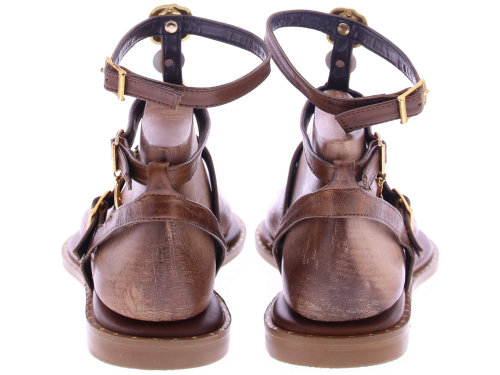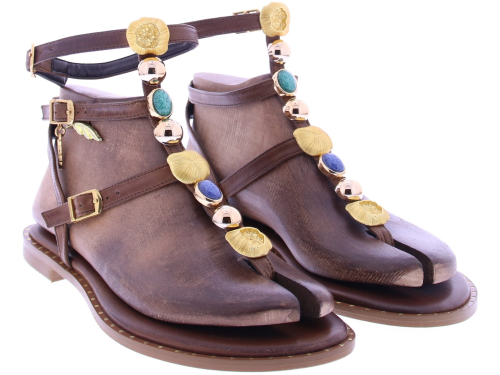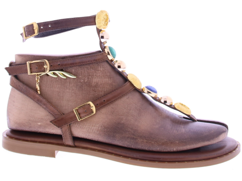 Bruin leren dames T-band sandaal van Caryatis. Deze sandaal is afgewerkt met gekleurde stenen en details in gehamerd goud, wat zorgt voor een luxe uitstraling. De gouden gespjes maken het model verstelbaar, terwijl de gouden spijkerkopjes in de zoolrand een stijlvol accent toevoegen. Een karaktervolle sandaal die perfect tot zijn recht komt bij zomerse jurken,of festival look. Ontdek ook de andere dames sandalen van Caryatis bij Klijsen.