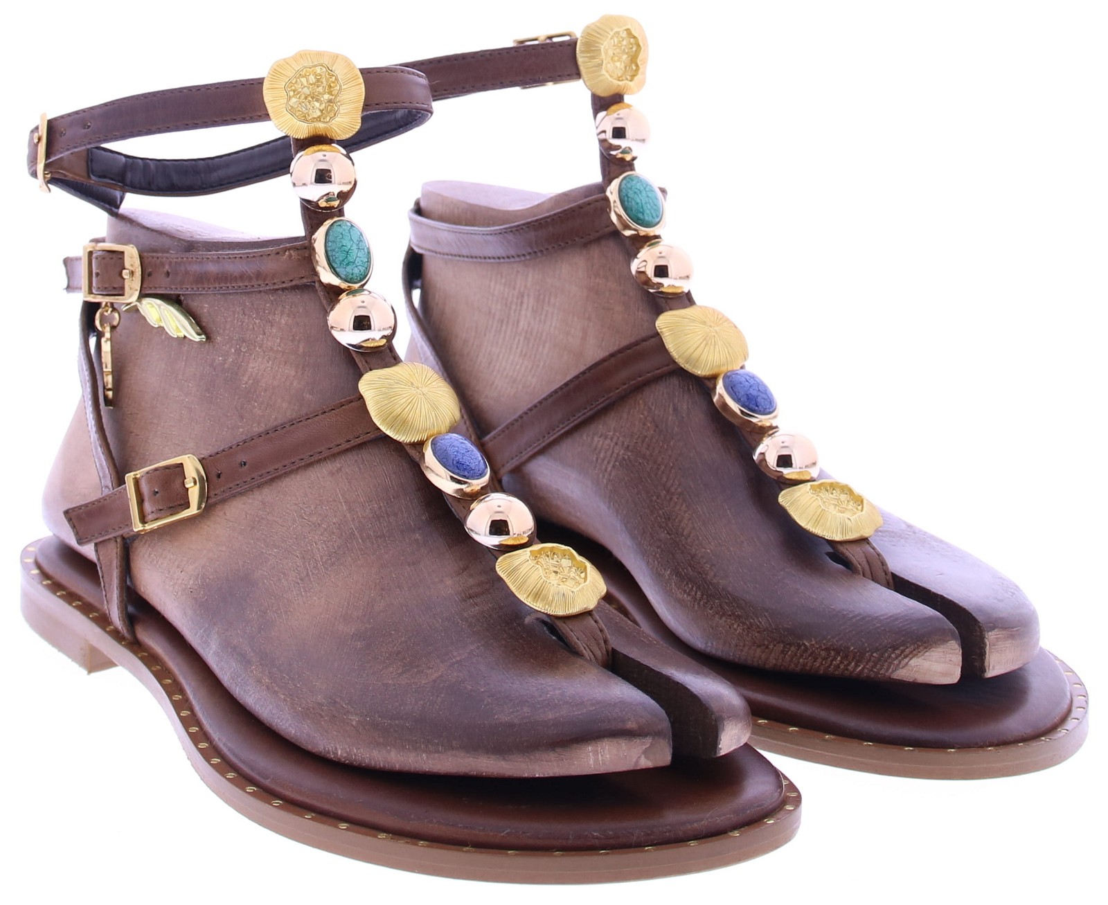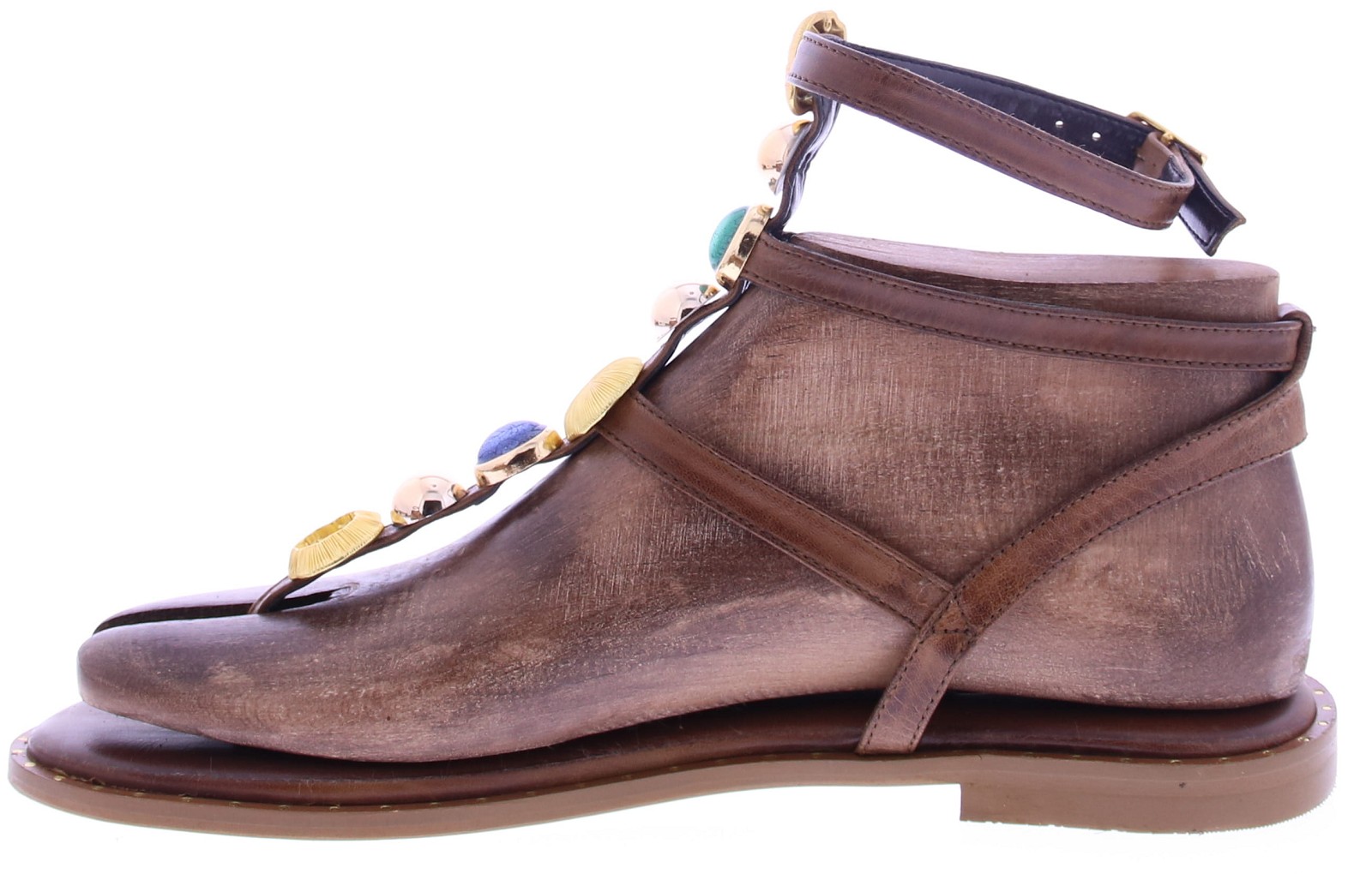 Bruin leren dames T-band sandaal van Caryatis. Deze sandaal is afgewerkt met gekleurde stenen en details in gehamerd goud, wat zorgt voor een luxe uitstraling. De gouden gespjes maken het model verstelbaar, terwijl de gouden spijkerkopjes in de zoolrand een stijlvol accent toevoegen. Een karaktervolle sandaal die perfect tot zijn recht komt bij zomerse jurken,of festival look. Ontdek ook de andere dames sandalen van Caryatis bij Klijsen.
