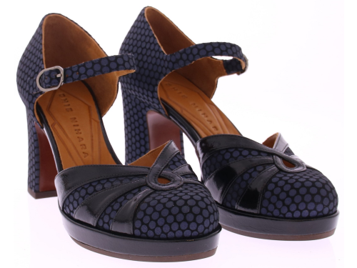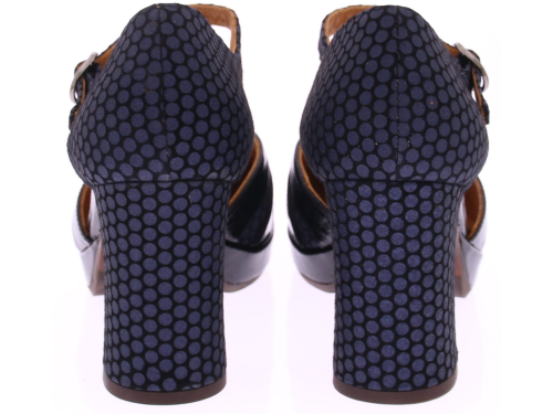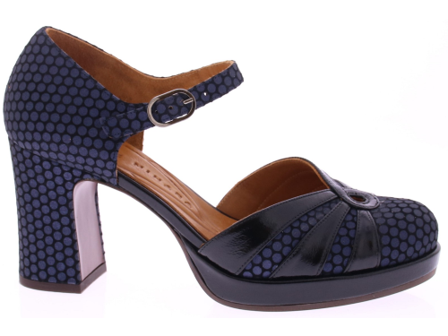 Zwart/blauwe dames pump van Chie Mihara in suede met lak. Uitgevoerd met een wreefbandje met gespje. De hak is 7 cm hoog en de plateauzool 1,5 cm, waardoor de hak lager voelt. Het Spaanse Chie Mihara staat bekend om zijn fantastische pasvorm en mooie kleur- en materiaalcombinaties die wij zelf samen stellen.