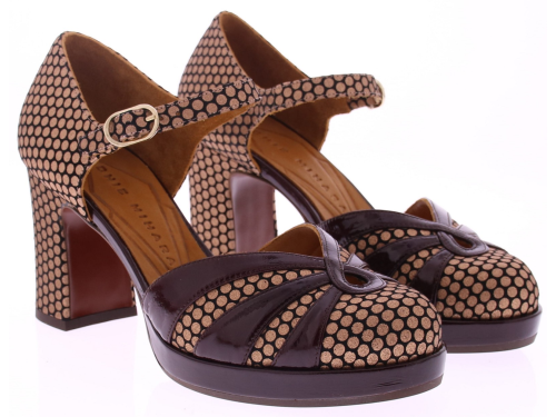 Bordeaux met brons dames pump van Chie Mihara in suede met lak. Uitgevoerd met een wreefbandje met gespje. De hak is 7 cm hoog en de plateauzool 1 cm, waardoor de hak lager voelt. Het Spaanse Chie Mihara staat bekend om zijn fantastische pasvorm en mooie kleur- en materiaalcombinaties die wij zelf samen stellen.