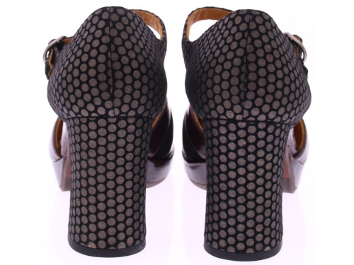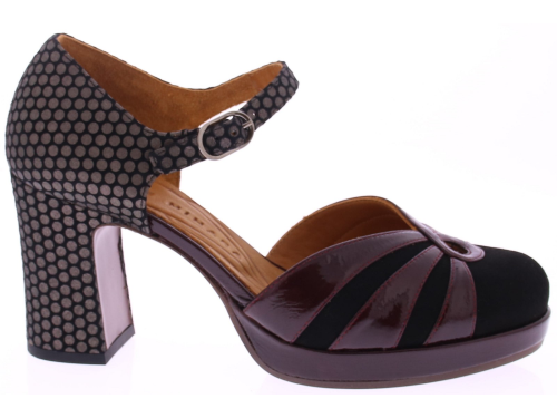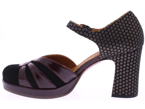 Zwart met metallic en bordeaux dames pump van Chie Mihara in suède met lak. Deze elegante pump heeft een combinatie van zacht suède en glanzend lakleer wat de schoen een unieke uitstraling geeft, terwijl het vrouwelijke silhouet en het verstelbare wreefbandje met gespje zorgen voor een perfecte pasvorm. De hak van 7 cm en de plateauzool van 1 cm zorgen voor een comfortabele draaghoogte. Het Spaanse Chie Mihara staat bekend om zijn fantastische pasvorm en mooie kleur- en materiaalcombinaties die wij zelf samen stellen.