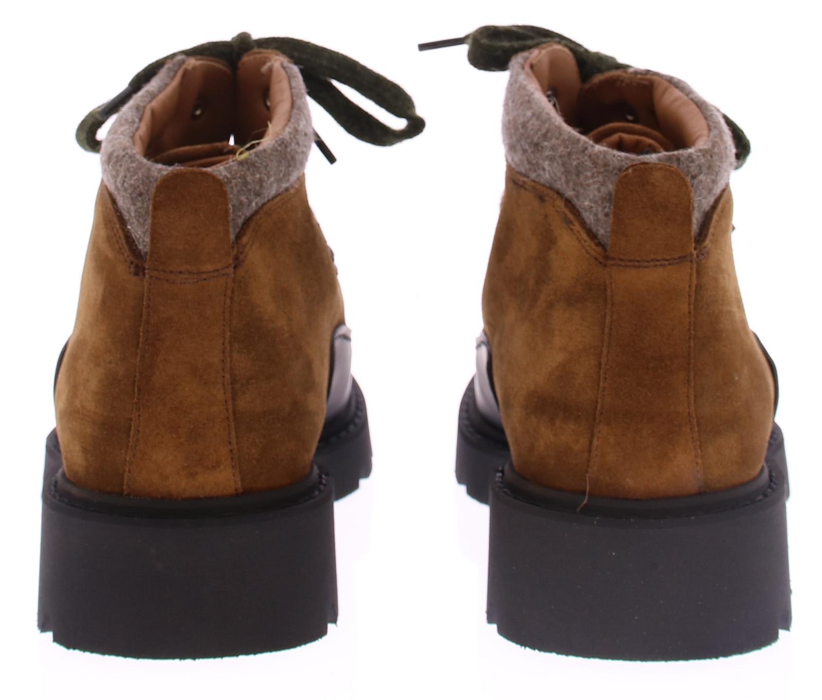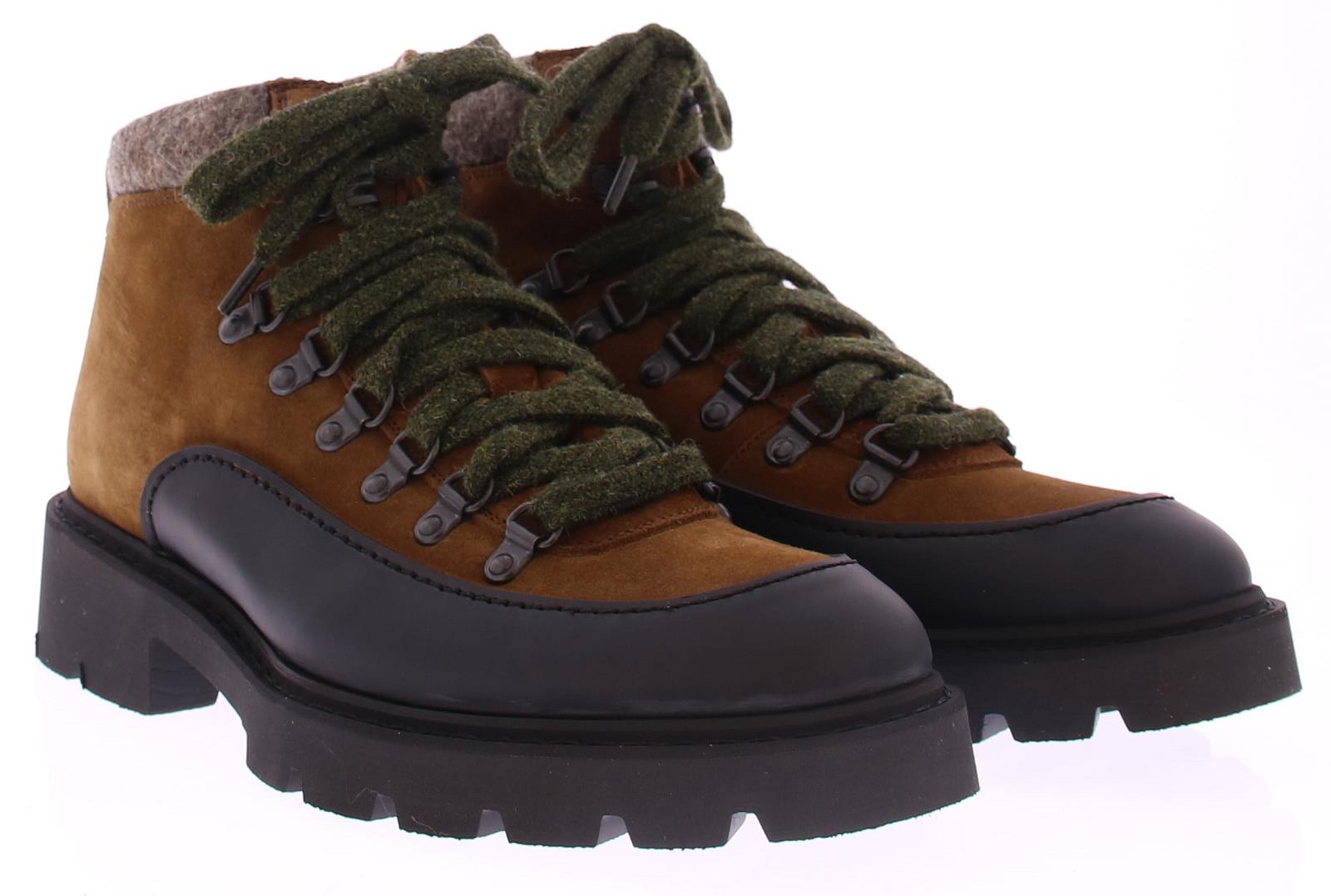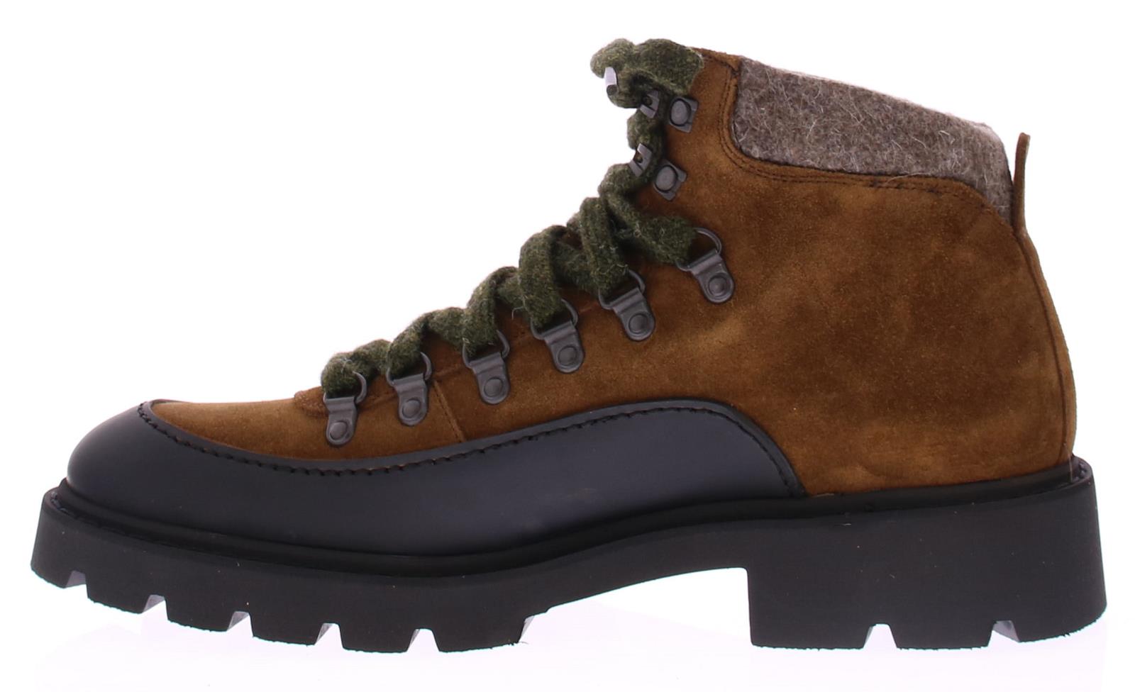 Heren bergboot van Calce. Deze in cognac suede uitgevoerde bergschoen met rubber omrand heeft door zijn gekleurde veter en wollen manchet een sportieve modische uitstraling. Daarnaast is dit merk erg goed in pasvorm en heeft al zijn schoenen met mooi kalfsleer gevoerd.