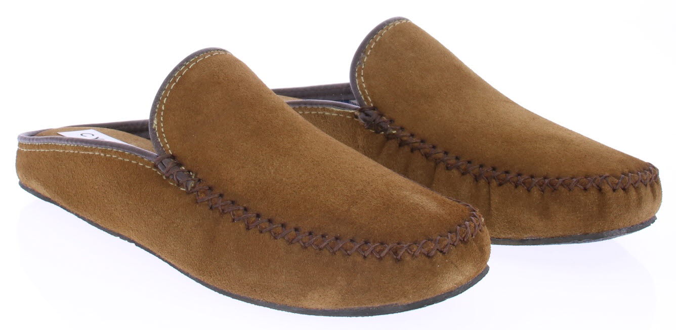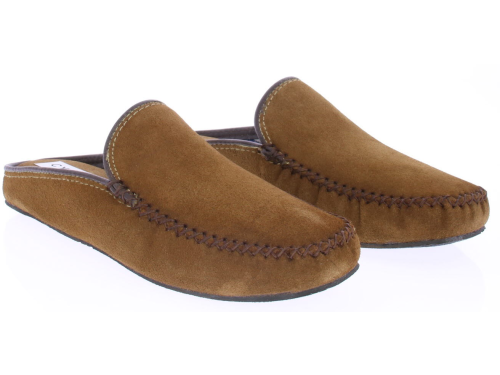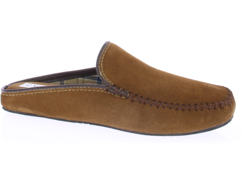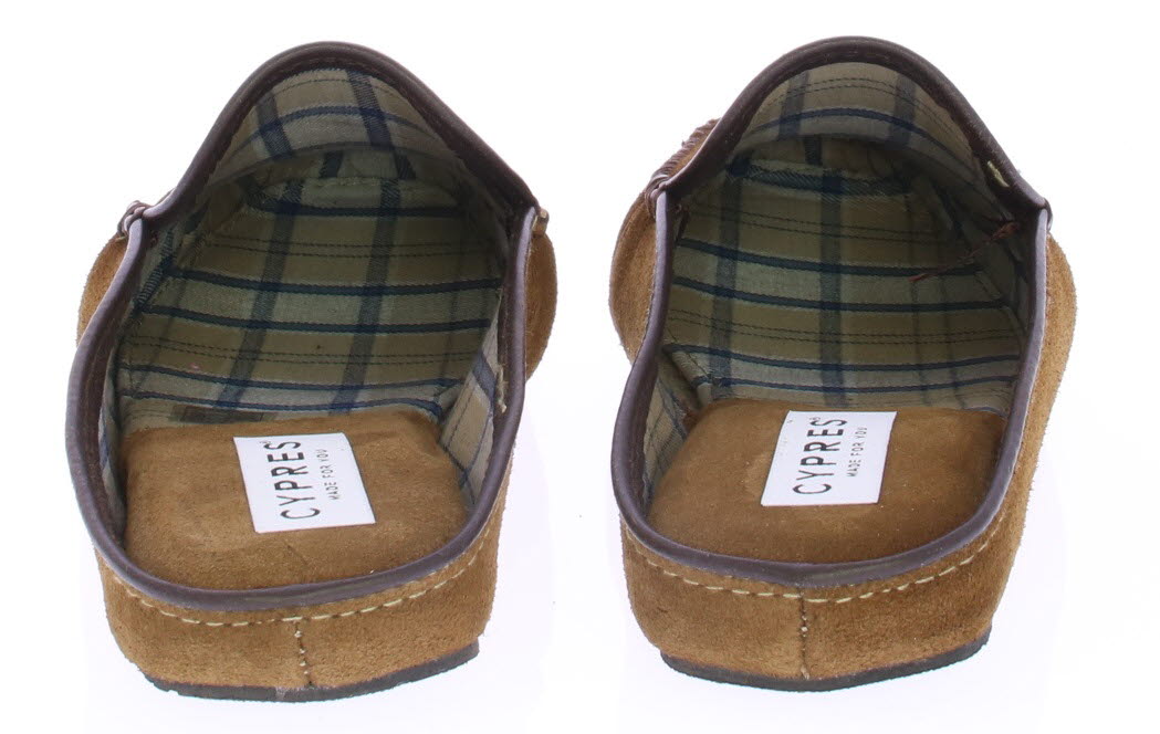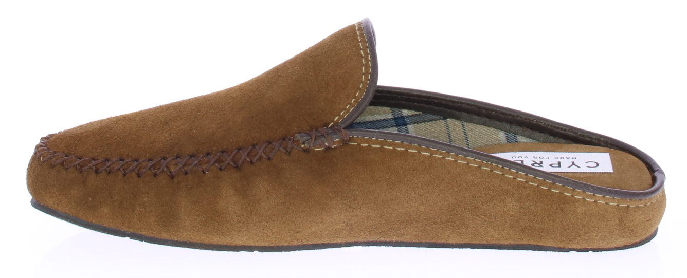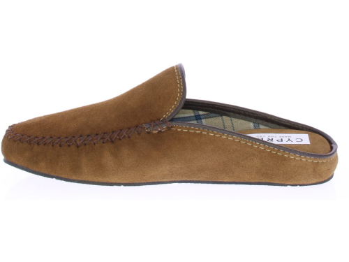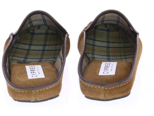 Cognac suede heren pantoffel van Cypres. De pantoffel heeft een stoffen voering met ruitjes print. De zool is van rubber.
