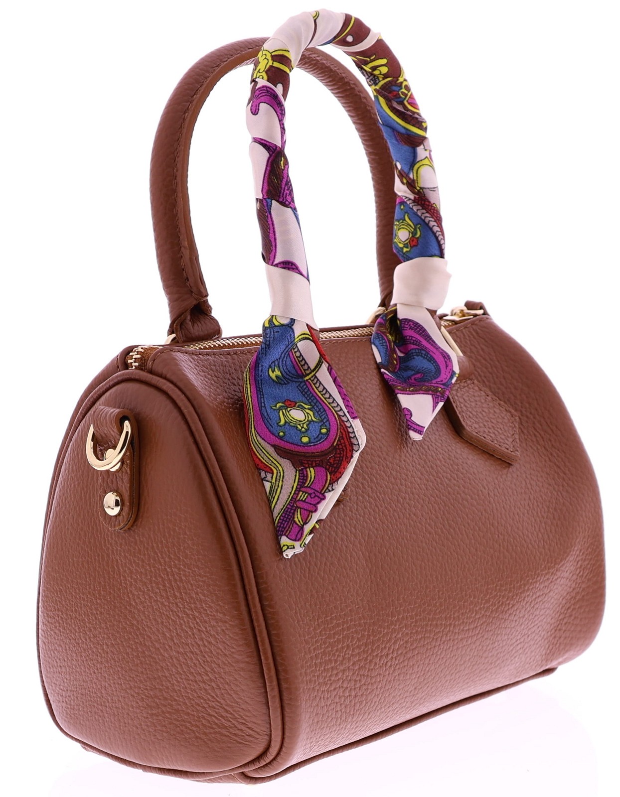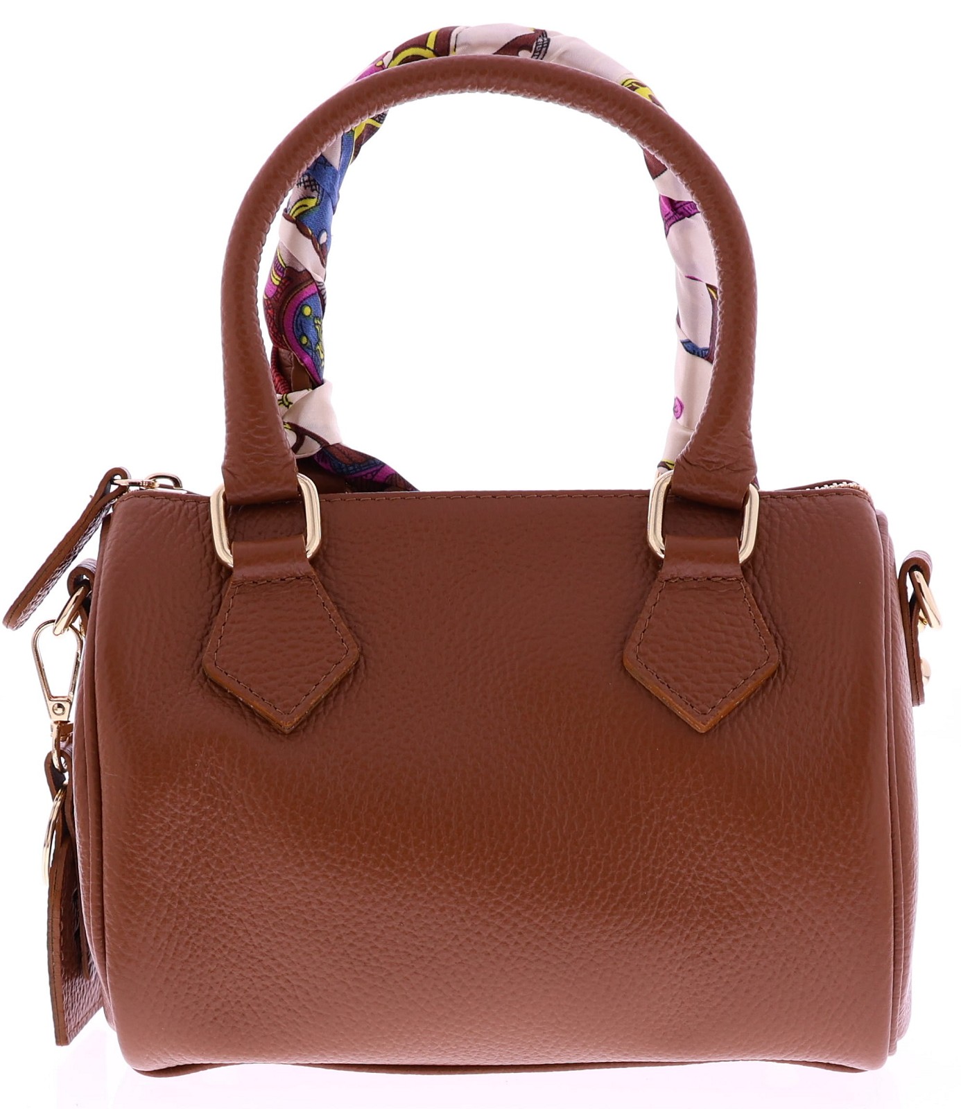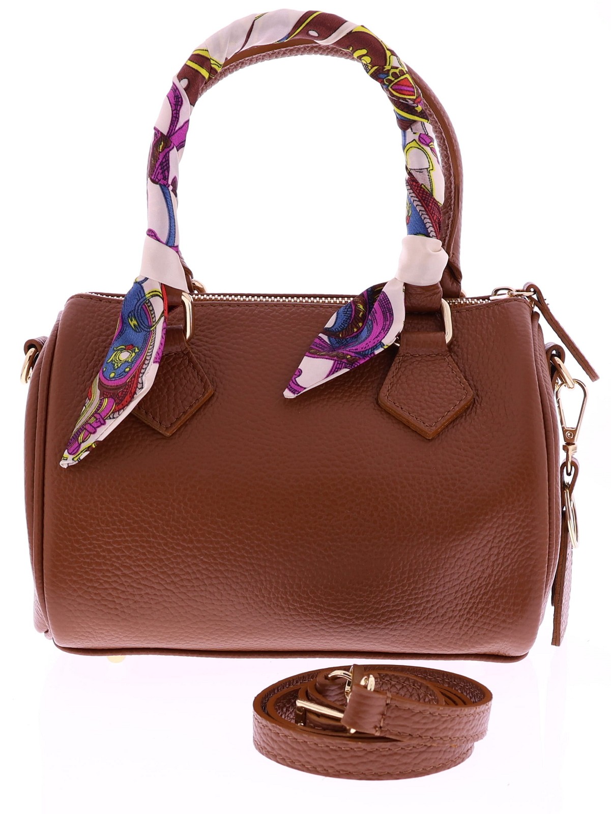 Cognackleurige leren damestas van Di Lauro, model Donna 001. Deze compacte tas is uitgevoerd in soepel leer met een subtiele structuur en heeft een stijlvolle, vrouwelijke uitstraling. Het korte handvat is omwikkeld met een bijpassende foulard voor een elegante finishing touch. Daarnaast wordt er een lang hengsel meegeleverd, zodat de tas ook crossbody gedragen kan worden. De afmetingen zijn 22 cm breed, 16 cm hoog en 12 cm diep: perfect voor dagelijks gebruik . Ontdek ook de andere dames tassen van Di Lauro bij Klijsen.