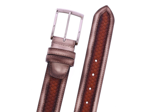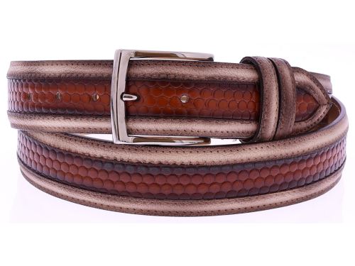Heren riem van het merk Harris. Deze riem heeft een middenstuk van cognac geprint leer. De buitenzijdes zijn afgewerkt met bruin leer. De riem is in te korten aan de gespkant. Deze riem is passend bij de schoen uit onze collectie met artikelnummer 44890.