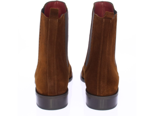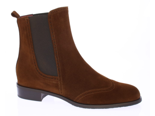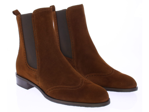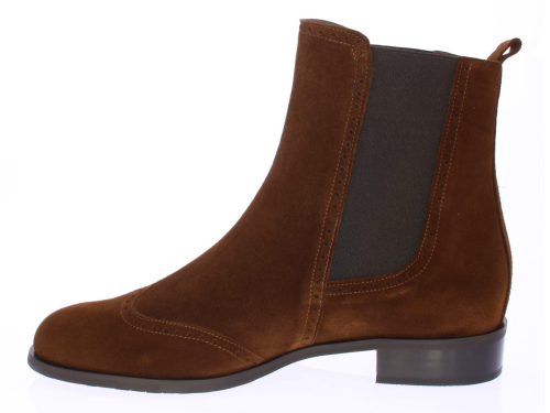 Cognac suede dames chelsea enkellaars van Lilian. Afgewerkt met perforatiebelijning en een hakje van 2 cm hoog. Voor een makkelijke instap heeft het laarsje aan beide kanten een elastiek.