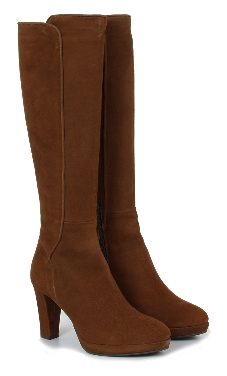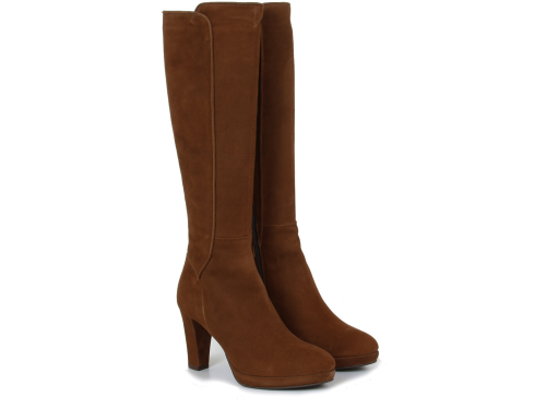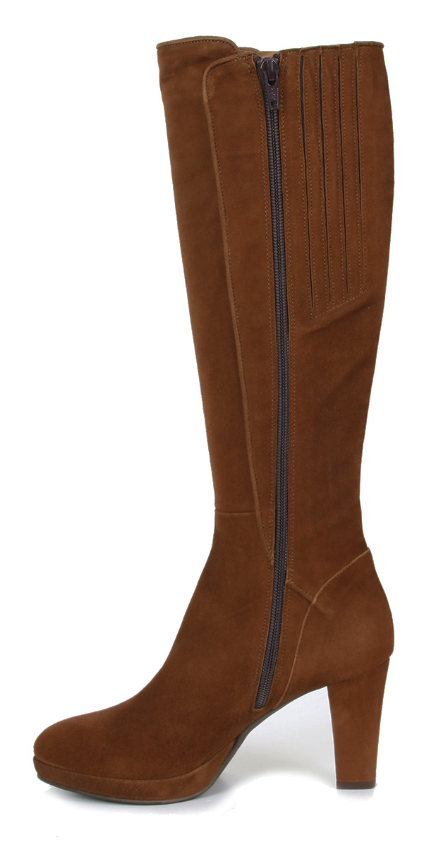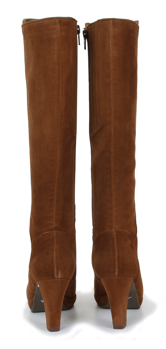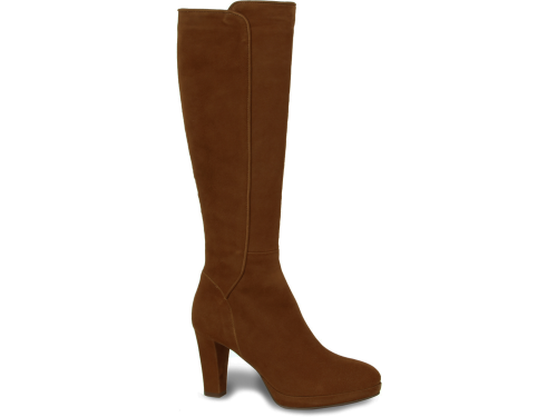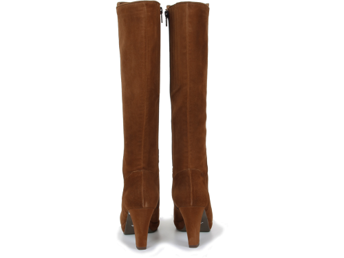 Cognac kleurige suede dames laarzen van Lilian. De laars heeft een XS schacht en is daardoor zeer geschikt voor dames met een smalle kuit. De elegante laarzen zijn uitgevoerd op een beklede plateauzool zodat de 8 cm hoge hak comfortabel JULI 22: FABRIEK MAAKT NIET MEER 06-06 13st/31-10 11st/02-01 8st/19-1 7X