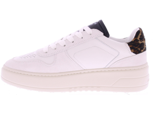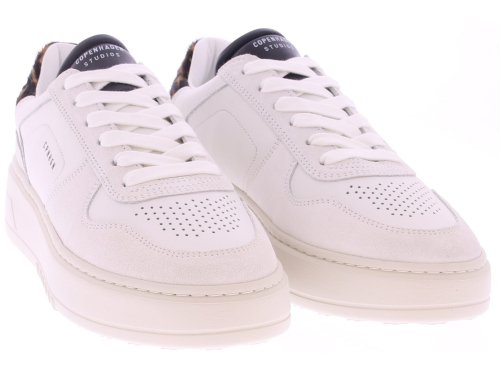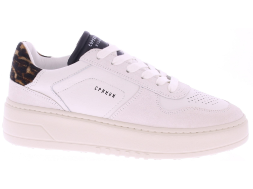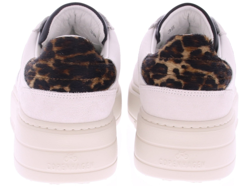 Wit leren sneaker voor dames van het merk Copenhagen. Deze lage sneaker de CPH75 heeft op de neus een perforatie in wit leer, met suede. Het hiel stuk is van luipaard pony haar. De binnenkant is uitgevoerd met een zachte leren voering. Het voetbed is uitneembaar. Perfect voor dagelijks gebruik en makkelijk te combineren met verschillende outfits.