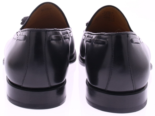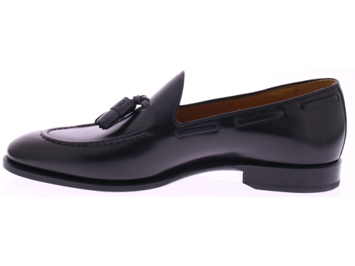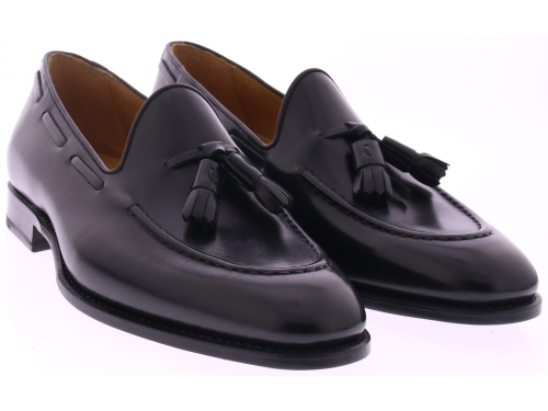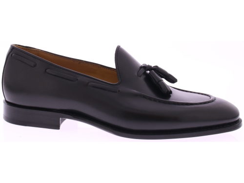 Zwarte leren heren loafer met kwastjes van Corden’s. Deze stijlvolle instapper is met de hand vervaardigd volgens de traditionele Goodyear-welted methode, wat garant staat voor duurzaamheid en optimaal draagcomfort. Het soepele kalfsleer heeft een subtiele glans die de verfijnde vorm perfect benadrukt. De leren zool versterkt het ambachtelijke karakter en biedt een elegante, klassieke uitstraling. De sierlijke kwastjes op de wreef geven de schoen een onderscheidend detail dat tijdloze klasse uitstraalt. De voering van zacht leer zorgt voor een prettig draaggevoel, terwijl het vaste voetbed stabiliteit biedt bij elke stap. Een schoen die moeiteloos stijl en vakmanschap combineert — ideaal voor formele gelegenheden of een verfijnde casual look.