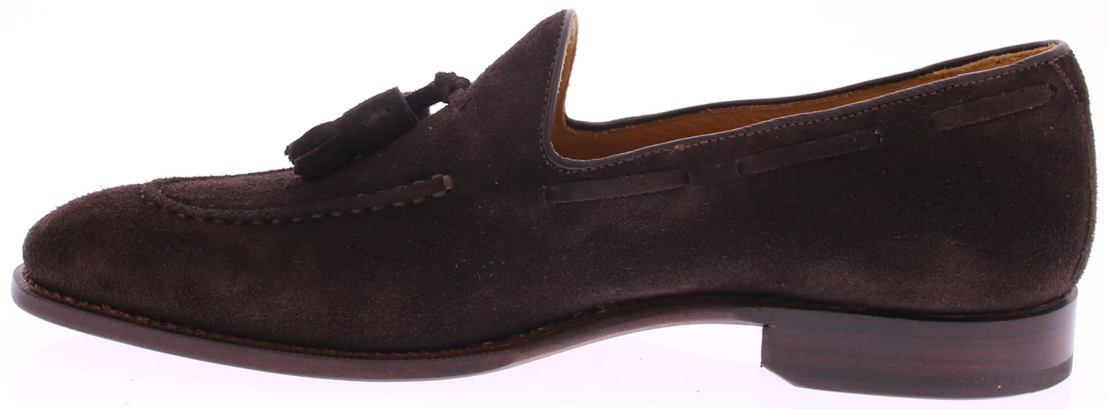 Donkerbruine suède heren loafer met kwastjes van Corden’s. Deze elegante instapper is met de hand vervaardigd in Portugal volgens de traditionele Goodyear-welted methode, wat zorgt voor een duurzame constructie en uitstekend draagcomfort. Het rijke suède in een diepe bruine tint geeft de schoen een warme, verfijnde uitstraling. De sierlijke kwastjes en subtiele stiksels benadrukken het ambachtelijke karakter van dit tijdloze ontwerp. De leren zool draagt bij aan de klassieke elegantie, terwijl de zachte lederen voering en het vaste voetbed zorgen voor een prettige pasvorm. Een stijlvolle loafer die moeiteloos combineert met zowel formele kleding als een meer casual look, en klasse toevoegt aan elke outfit.
