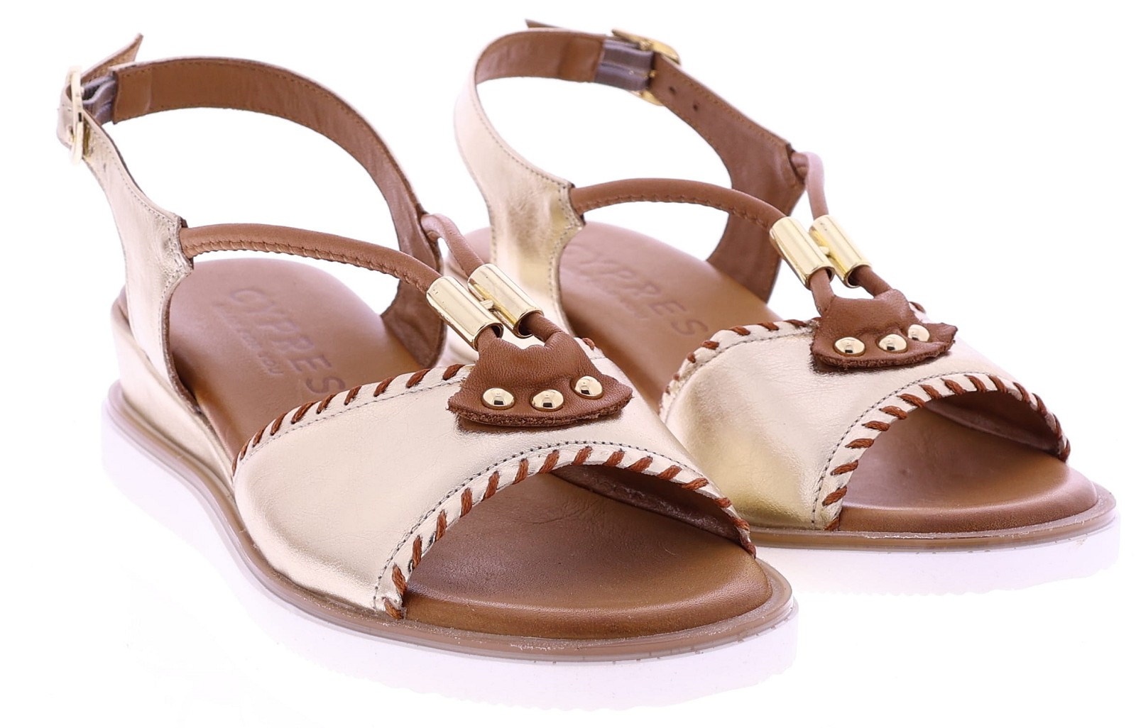 Platina leren dames sandalen van Cypres, model Zala. Gemaakt van soepel, zacht leer dat prettig aanvoelt en zich naar de voet vormt. De voorste bandjes zijn afgewerkt met kleine studs voor een stijlvolle, eigentijdse touch. Het zachte voetbed biedt langdurig draagcomfort, terwijl de verstelbare hielband met goudkleurig gespje zorgt voor een goede aansluiting rond de enkel. De lichte zool geeft de sandaal een frisse uitstraling.