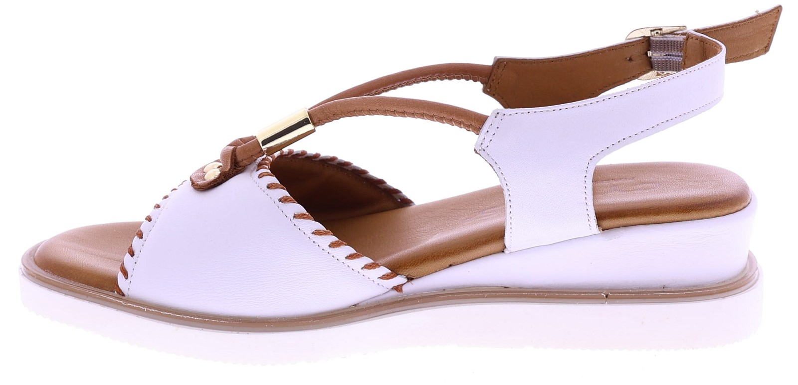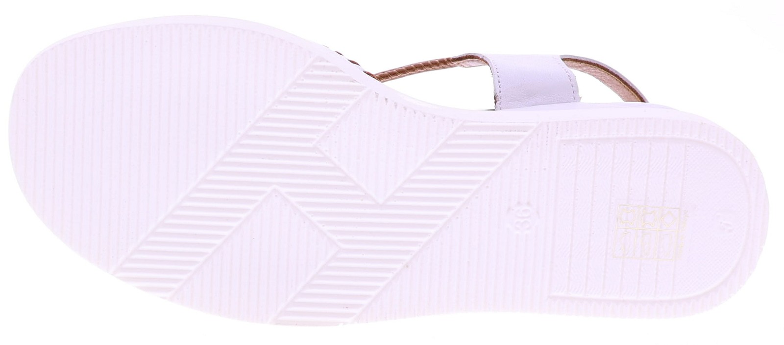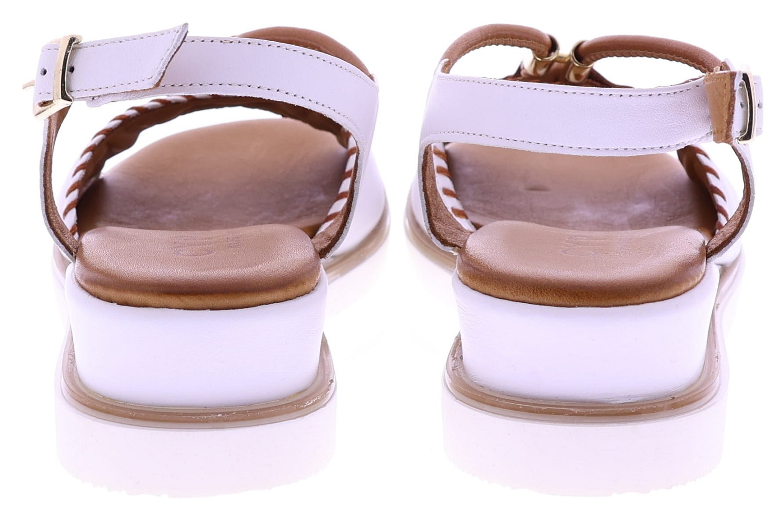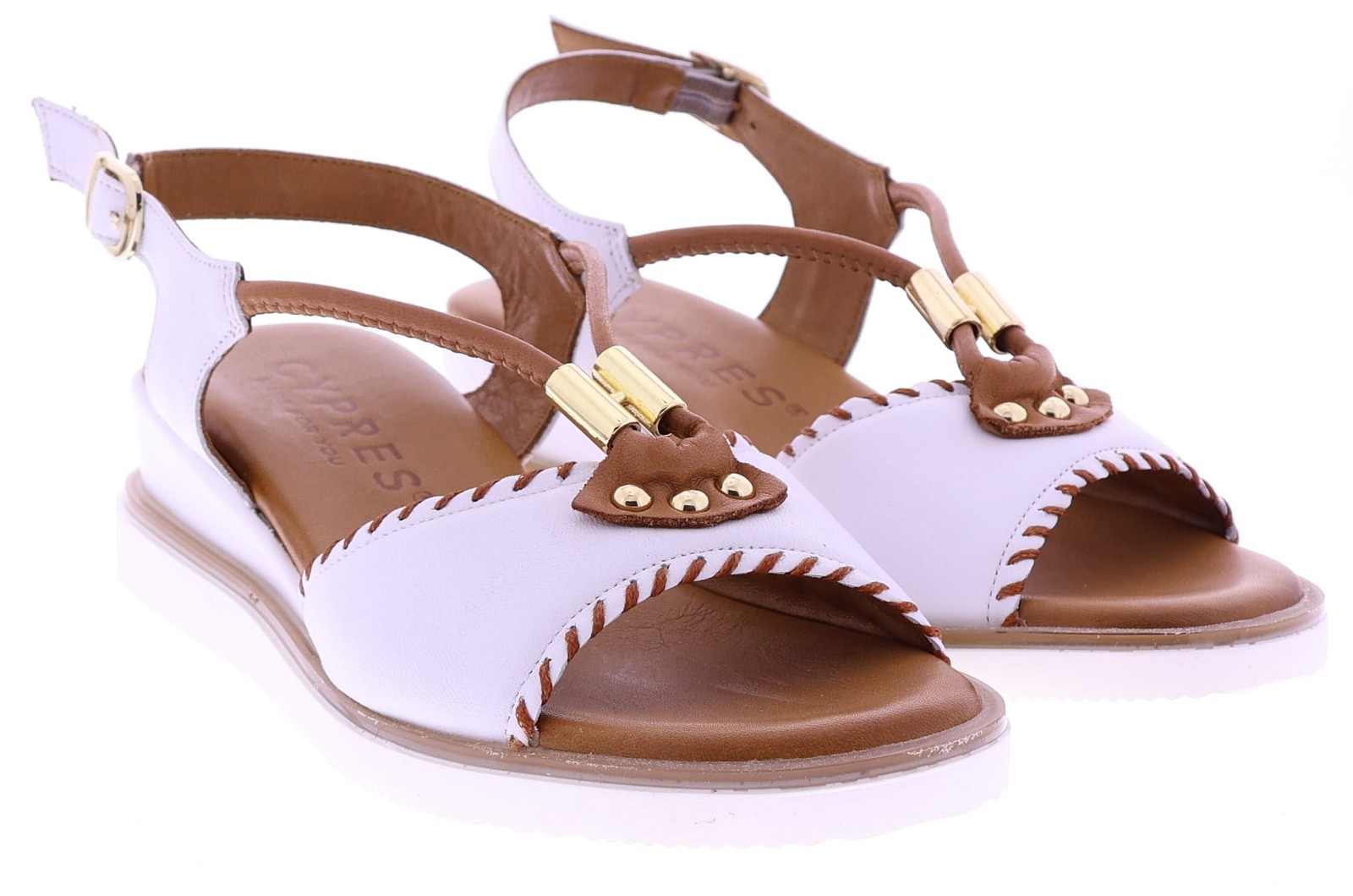 Wit leren dames sandalen van Cypres, model Zala. Gemaakt van soepel, zacht leer dat prettig aanvoelt en zich naar de voet vormt. De voorste bandjes zijn afgewerkt met kleine studs voor een stijlvolle, eigentijdse touch. Het zachte voetbed biedt langdurig draagcomfort, terwijl de verstelbare hielband met goudkleurig gespje zorgt voor een goede aansluiting rond de enkel. De lichte zool geeft de sandaal een frisse uitstraling.