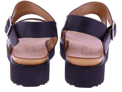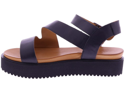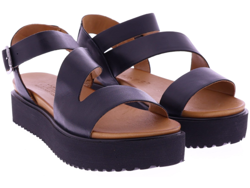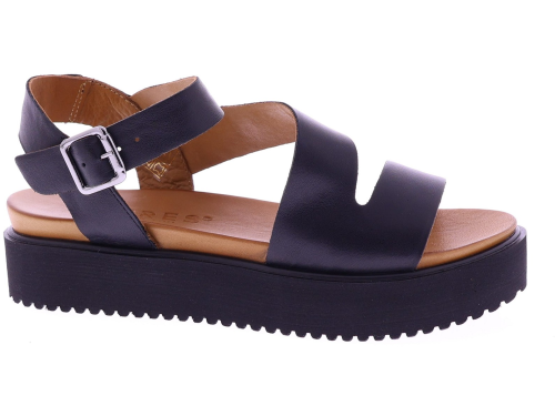 Zwarte leren dames sandalen van Cypres, model Thera. Het ontwerp met brede kruisbanden geeft een tijdloze, moderne uitstraling en vormt zich soepel naar de voet. Deze sandaal heeft een verstelbare gespsluiting bij de enkel voor een goede pasvorm en gemakkelijke instap. De zwarte plateauzool van 2 cm zorgt voor een natuurlijke houding en aangenaam comfort bij dagelijks gebruik. Een eigentijdse, stijlvolle sandaal leuk voor onder een jurk of rok.