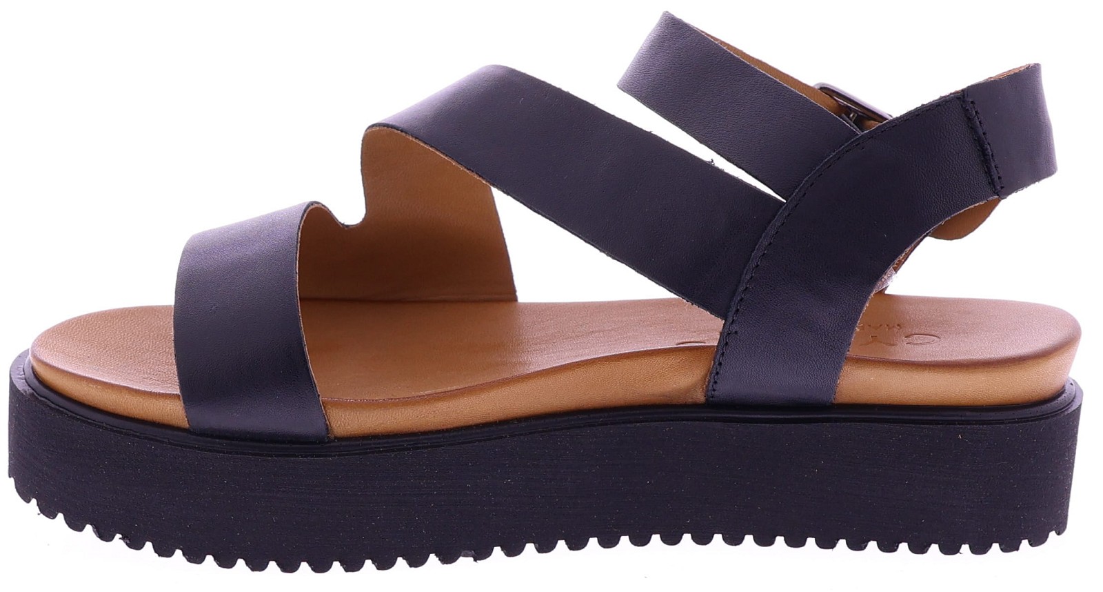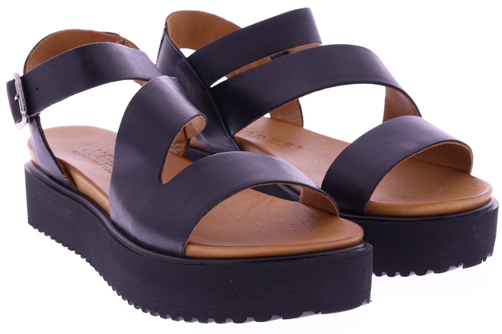 Zwarte leren dames sandalen van Cypres, model Thera. Het ontwerp met brede kruisbanden geeft een tijdloze, moderne uitstraling en vormt zich soepel naar de voet. Deze sandaal heeft een verstelbare gespsluiting bij de enkel voor een goede pasvorm en gemakkelijke instap. De zwarte plateauzool van 2 cm zorgt voor een natuurlijke houding en aangenaam comfort bij dagelijks gebruik. Een eigentijdse, stijlvolle sandaal leuk voor onder een jurk of rok.