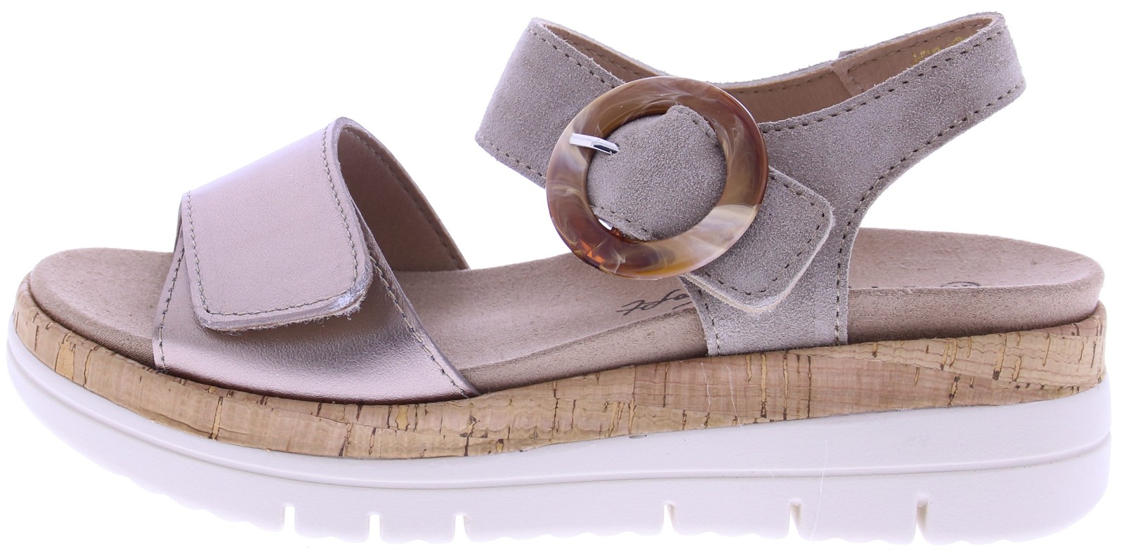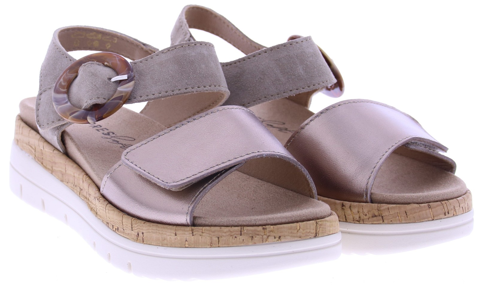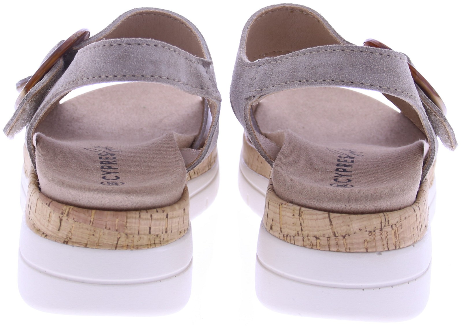 Brons leren met suède dames sandalen van Cypres model Zosja. Dit model heeft een lichte sleehak van 2 cm voor subtiele hoogte en stabiliteit. De verstelbare klittenbandsluiting op de voorvoet zorgt voor een perfecte pasvorm, terwijl de grote ronde gespsluiting een elegant detail toevoegt. Het zachte uitneembare voetbed en de lichte loopzool bieden optimaal draagcomfort, ideaal voor lange zomerdagen vol stijl en gemak.