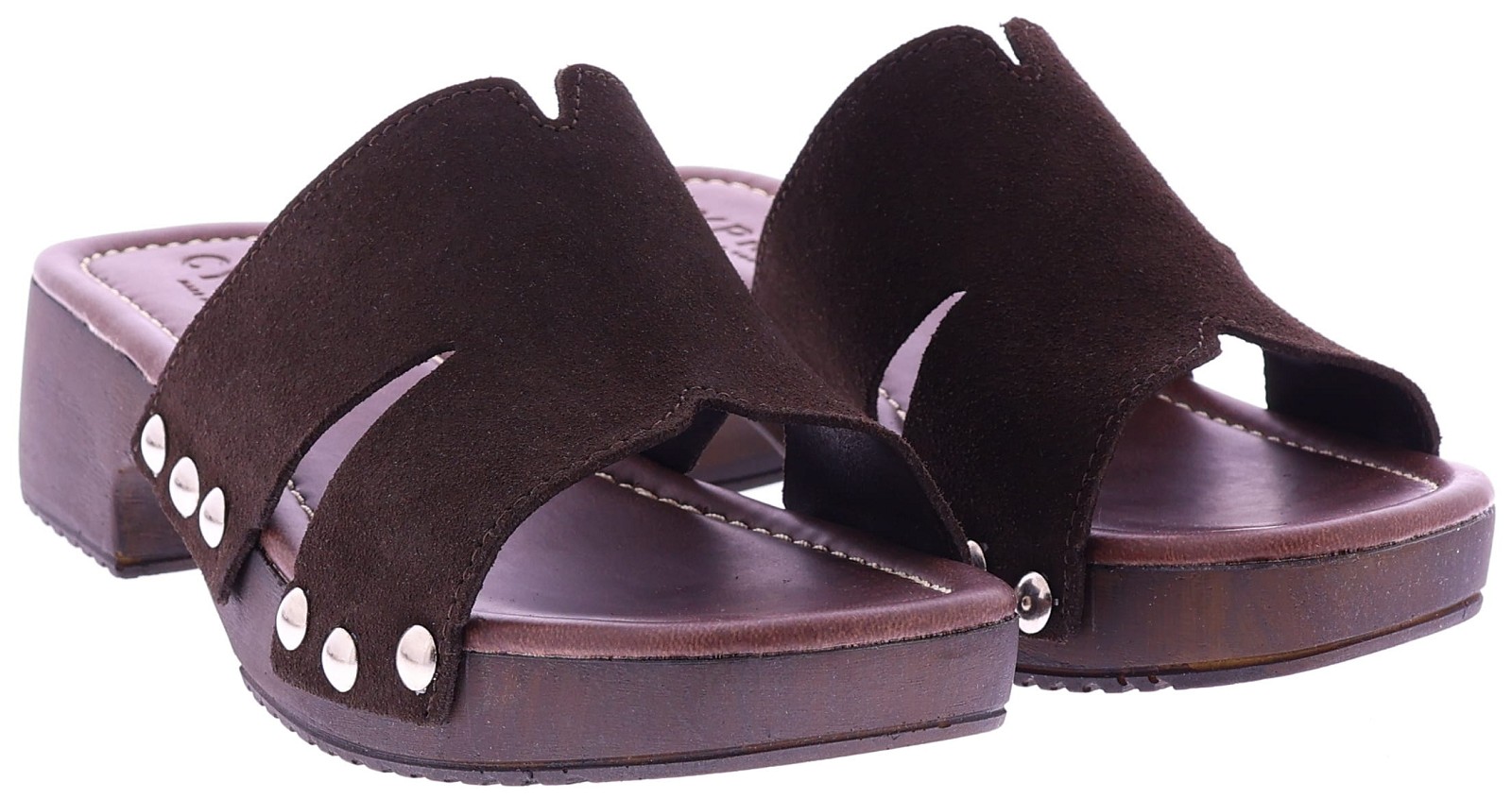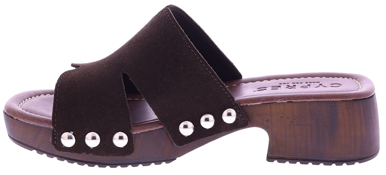 Donkerbruine suède dames slippers van Cypres, model Ziare. Deze slipper heeft een brede bovenband met stoere metalen studs langs de zijkant. De slipper heeft een plateau van 2 cm en een hakhoogte van 4 cm, uitgevoerd in een houtlook. Het voetbed is zacht afgewerkt voor prettig draagcomfort en ideaal voor dagelijks zomers gebruik. Leuk te combineren met een jeansrok of een linnen broek. "Ontdek ook de andere dames slippers van Cypres bij Klijsen.