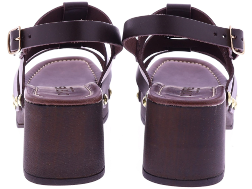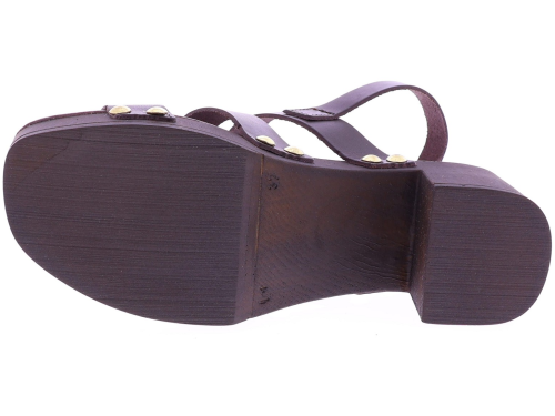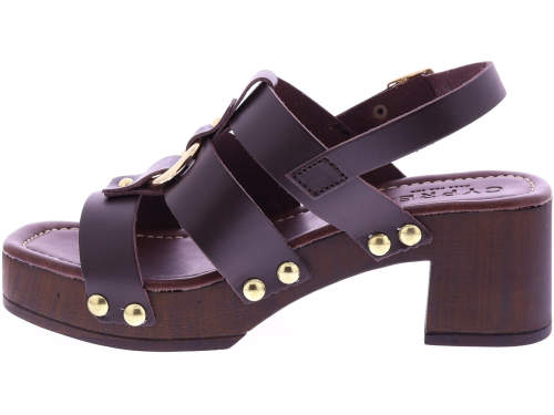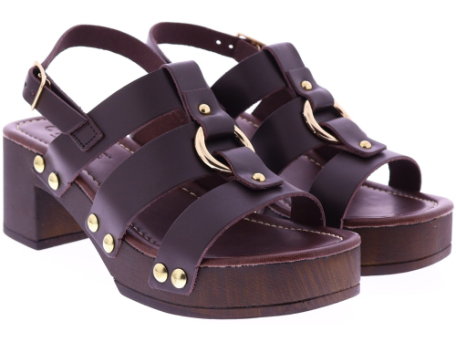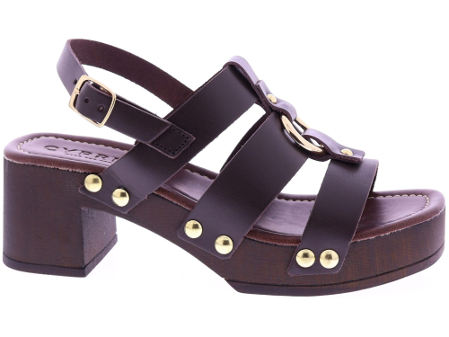 Donkerbruine leren dames sandalen van Cypres, model Zonaira. Deze slipper heeft meerdere bandjes met goudkleurige studs en een grote metalen ring op de wreef. De sandaal een plateau van 3 cm en een hakhoogte van 6 cm, uitgevoerd in een houtlook. Het voetbed is zacht afgewerkt voor prettig draagcomfort, ideaal voor zomerse dagen en een stijlvolle outfit. "Ontdek ook de andere dames sandalen van Cypres bij Klijsen."