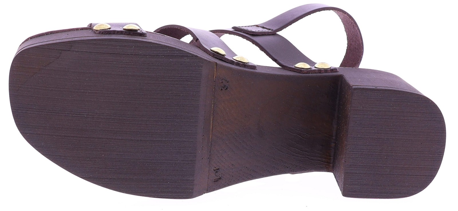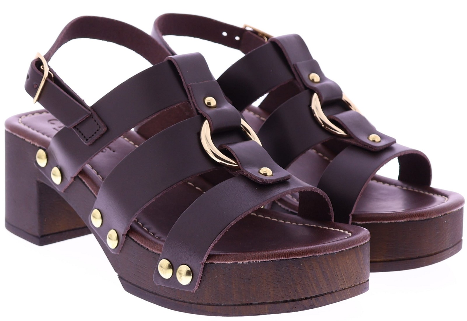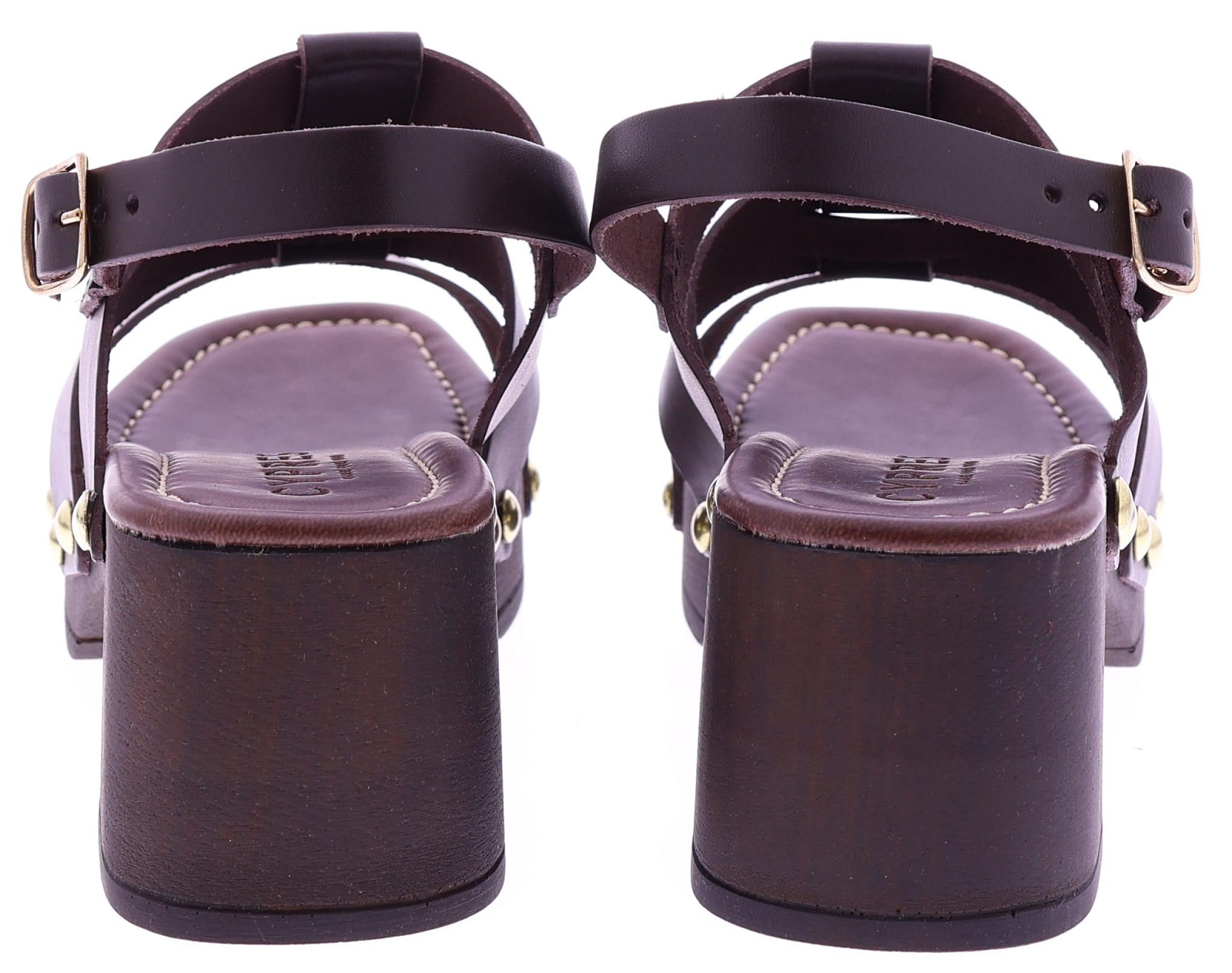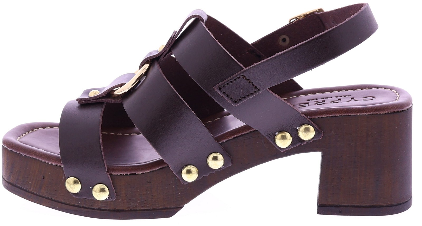 Donkerbruine leren dames sandalen van Cypres, model Zonaira. Deze slipper heeft meerdere bandjes met goudkleurige studs en een grote metalen ring op de wreef. De sandaal een plateau van 3 cm en een hakhoogte van 6 cm, uitgevoerd in een houtlook. Het voetbed is zacht afgewerkt voor prettig draagcomfort, ideaal voor zomerse dagen en een stijlvolle outfit. "Ontdek ook de andere dames sandalen van Cypres bij Klijsen."