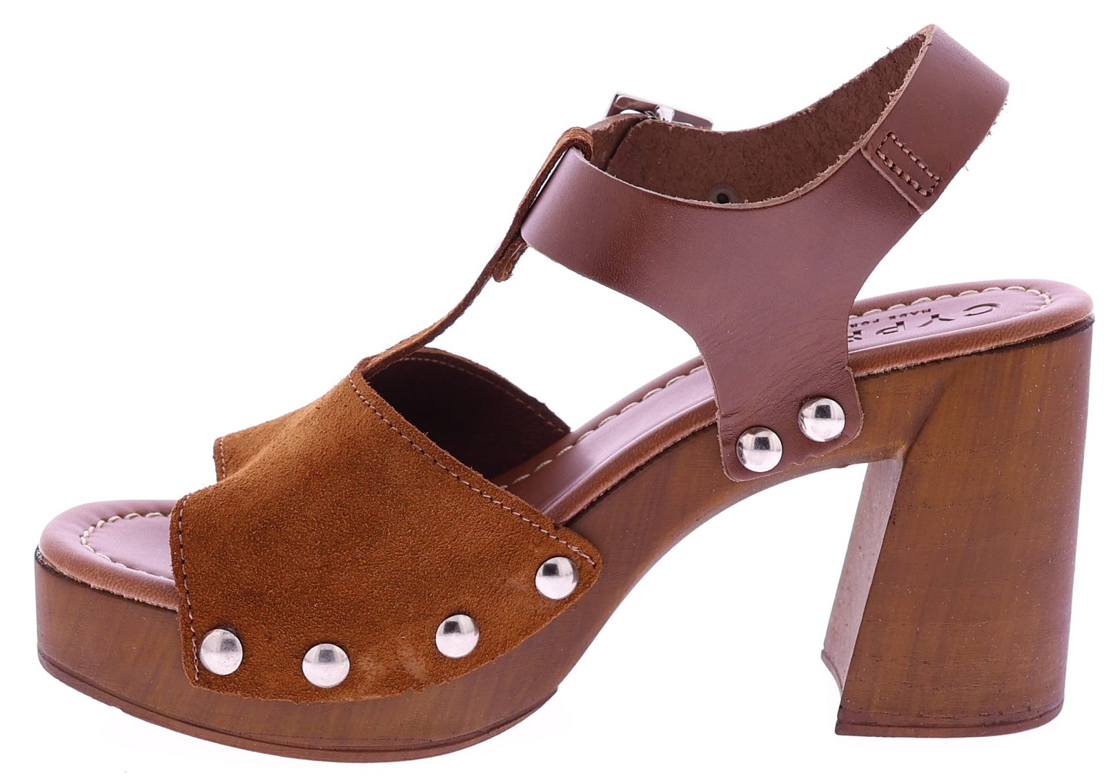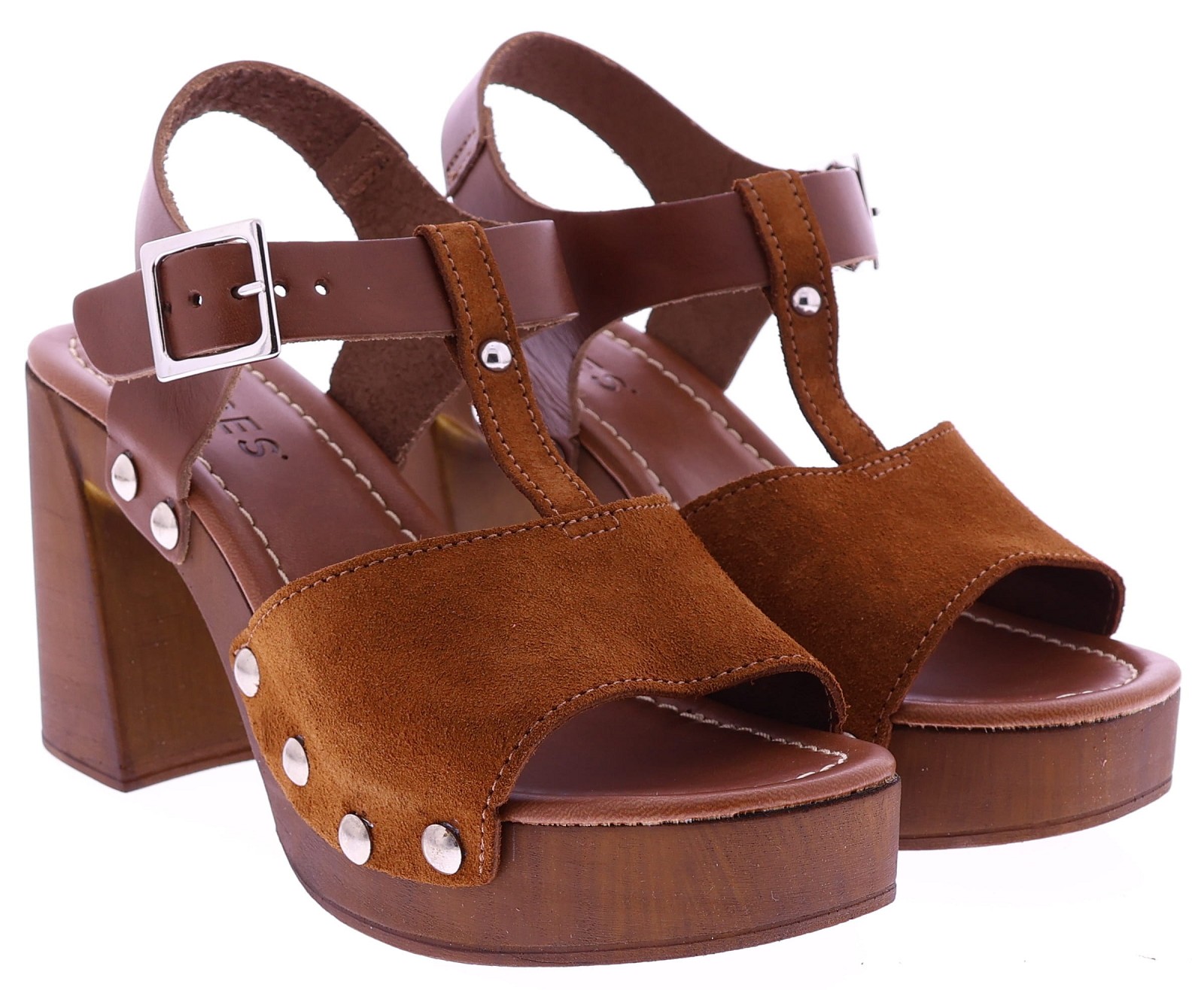 Cognackleurige suède dames sandalen van Cypres, model Zarita. Deze sandaal heeft een T-brede band over de wreef met studs aan de zijkanten. De sandaal heeft een plateau van 3 cm en een hakhoogte van 8 cm. Het voetbed is zacht afgewerkt voor prettig draagcomfort, ideaal voor zomerse dagen en een stijlvolle outfit. "Ontdek ook de andere dames sandalen van Cypres bij Klijsen."