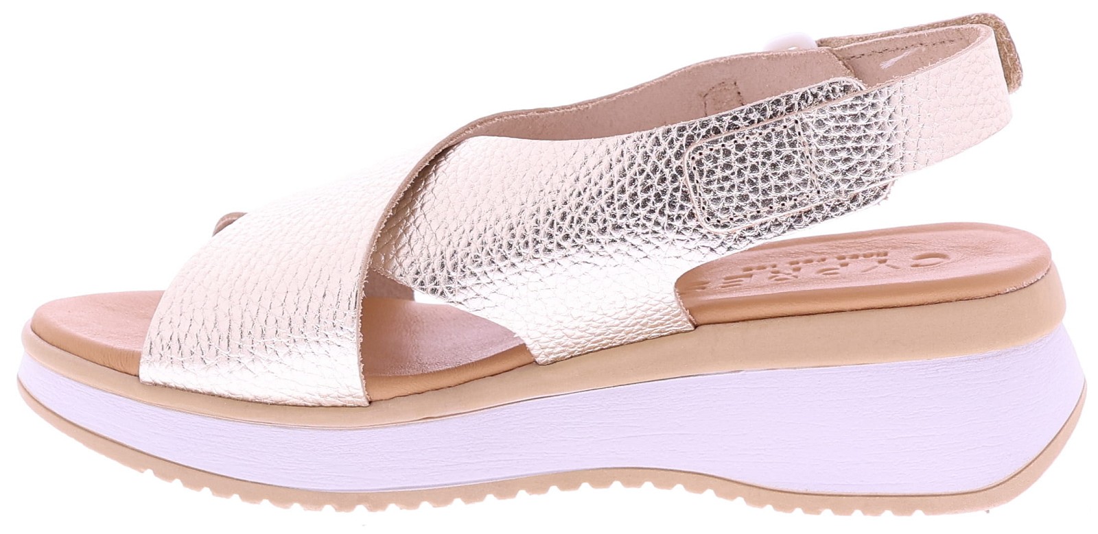 Goudkleurige leren dames sandalen van Cypres, model Zalicia. Deze sandaal is gemaakt van leer met een fijne structuur en heeft een kruisband die zorgt voor een goede en ondersteunende pasvorm. Het superzachte voetbed heeft een fijn draagcomfort, ideaal voor dagelijks gebruik. De hielsluiting heeft een klittenbandje waarmee de sandaal gemakkelijk is te verstellen. De sleehak heeft een hoogte van 3 cm. Leuk te combineren met een luchtige zomerjurk of een casual broek. Ontdek ook de andere dames sandalen van Cypres bij Klijsen.