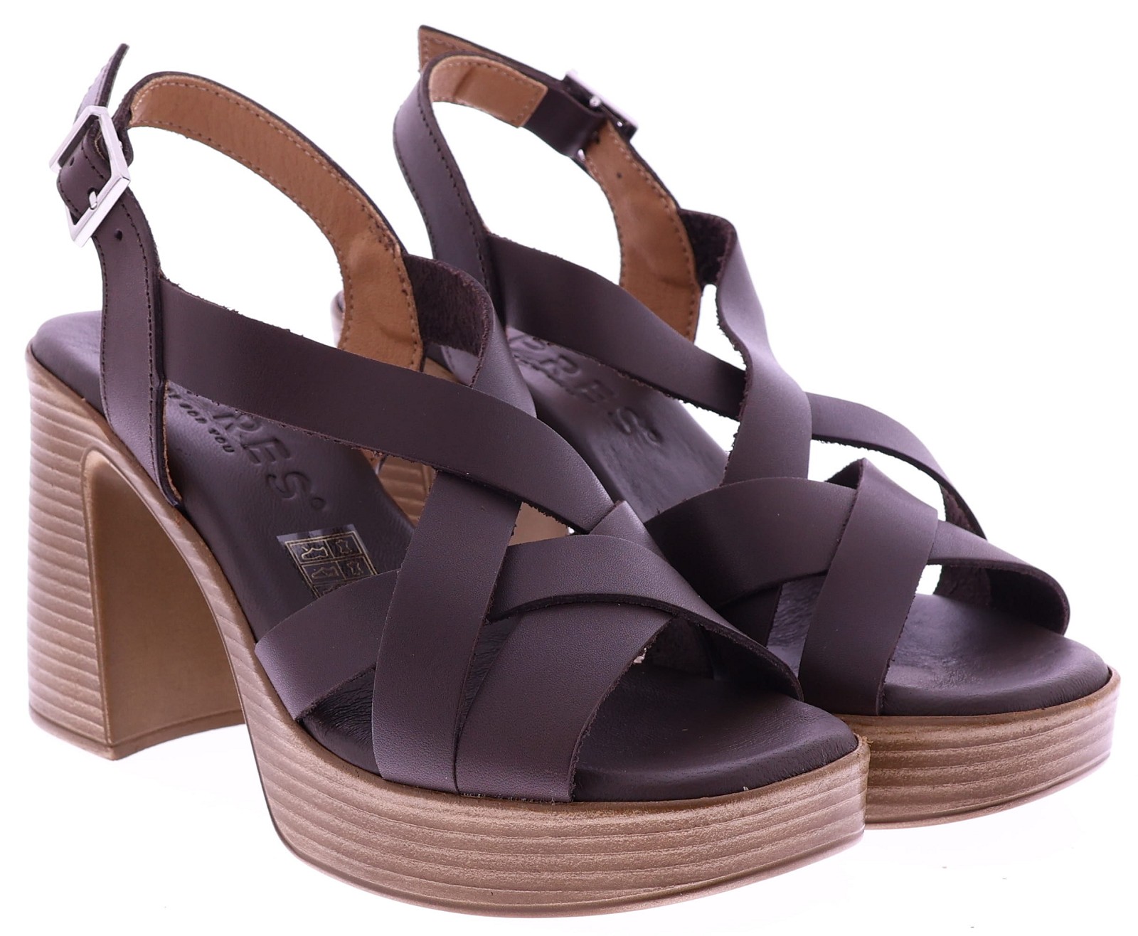 Donkerbruine leren dames sandalen van Cypres, model Zoli. Deze sandaal heeft gekruiste bandjes over de voorvoet en een verstelbaar enkelbandje. De blokhak staat iets naar binnen en heeft een hoogte van 8,5 cm, gecombineerd met een plateauzool van 2 cm voor een stabiel en prettig draaggevoel. De zool is gemaakt van thunit. Een modieuze sandaal die mooi staat bij zowel een zomerse broek als een elegante jurk. Ontdek ook de andere dames sandalen van Cypres bij Klijsen.